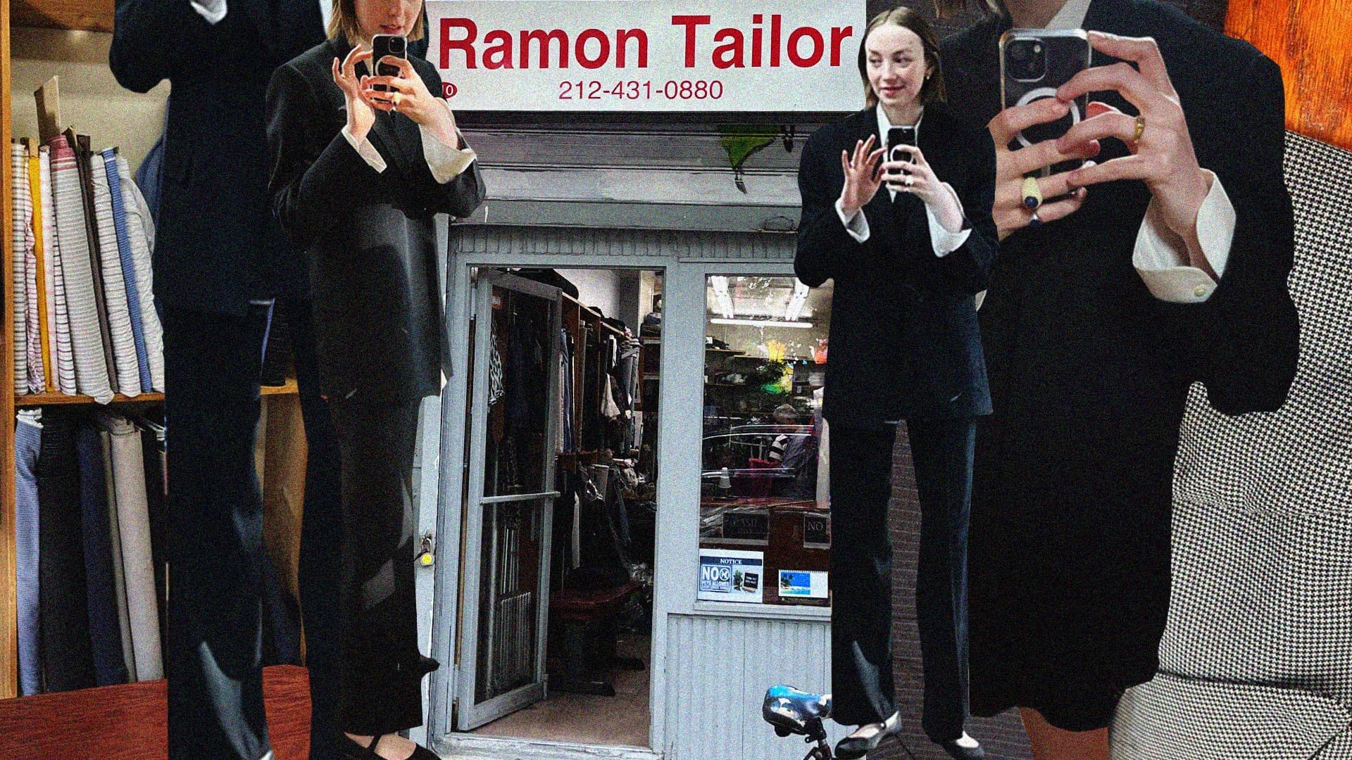 Scouring my Pinterst boards for chic women in menswear was hardly what I’d call research. I spent an hour looking for common threads between looks. I liked the idea of something black, easy to break up with a silk slip or form-fitting top. I searched my favorite suiting brands, just a touch out of my budget, for inspiration. From my own closet, I grabbed my favorite pants—vintage from the 40s that I discovered at a Parisian thrift store—and a lucky blazer I’d scored on eBay. Armed with screenshots and two of my wardrobe’s greatest hits, I took the train to Ramon’s shop.