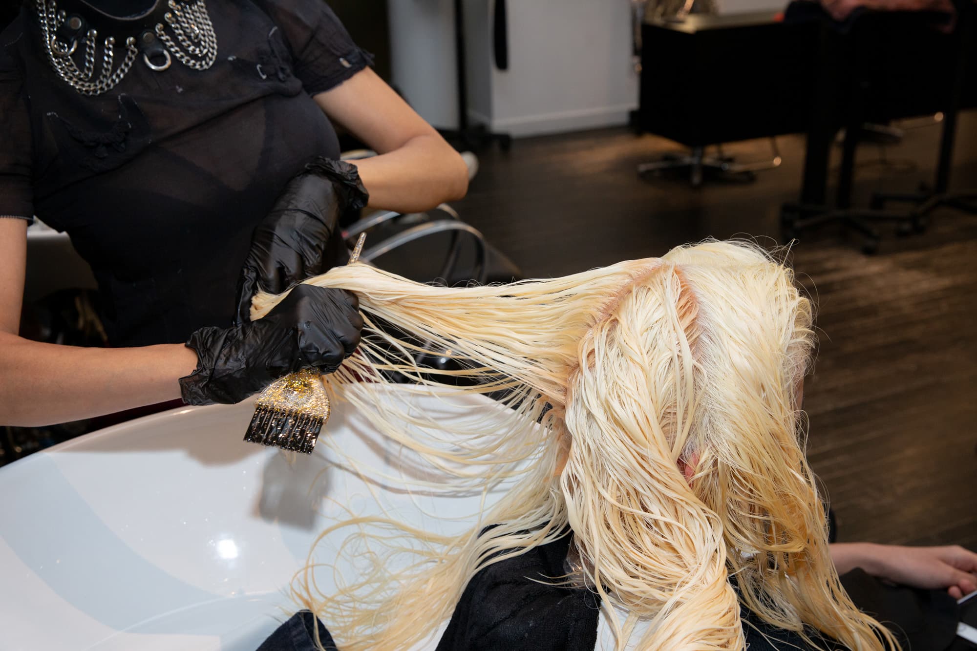 . The colorist worked with an assistant to paint the bleach on paper-thin sections, leaving a half-inch at the top so the heat from Leilla’s scalp wouldn’t cause the hair to lighten too quickly—and wind up a different color than the ends. Friedman and her team use plastic wrap instead of foils to divide the hair, again, to keep it from incubating and lifting before the ends. The technique is all about applying the bleach as quickly as possible, and lightening as much as possible on the first round, since re-bleaching can cause significantly more damage to the hair follicle.