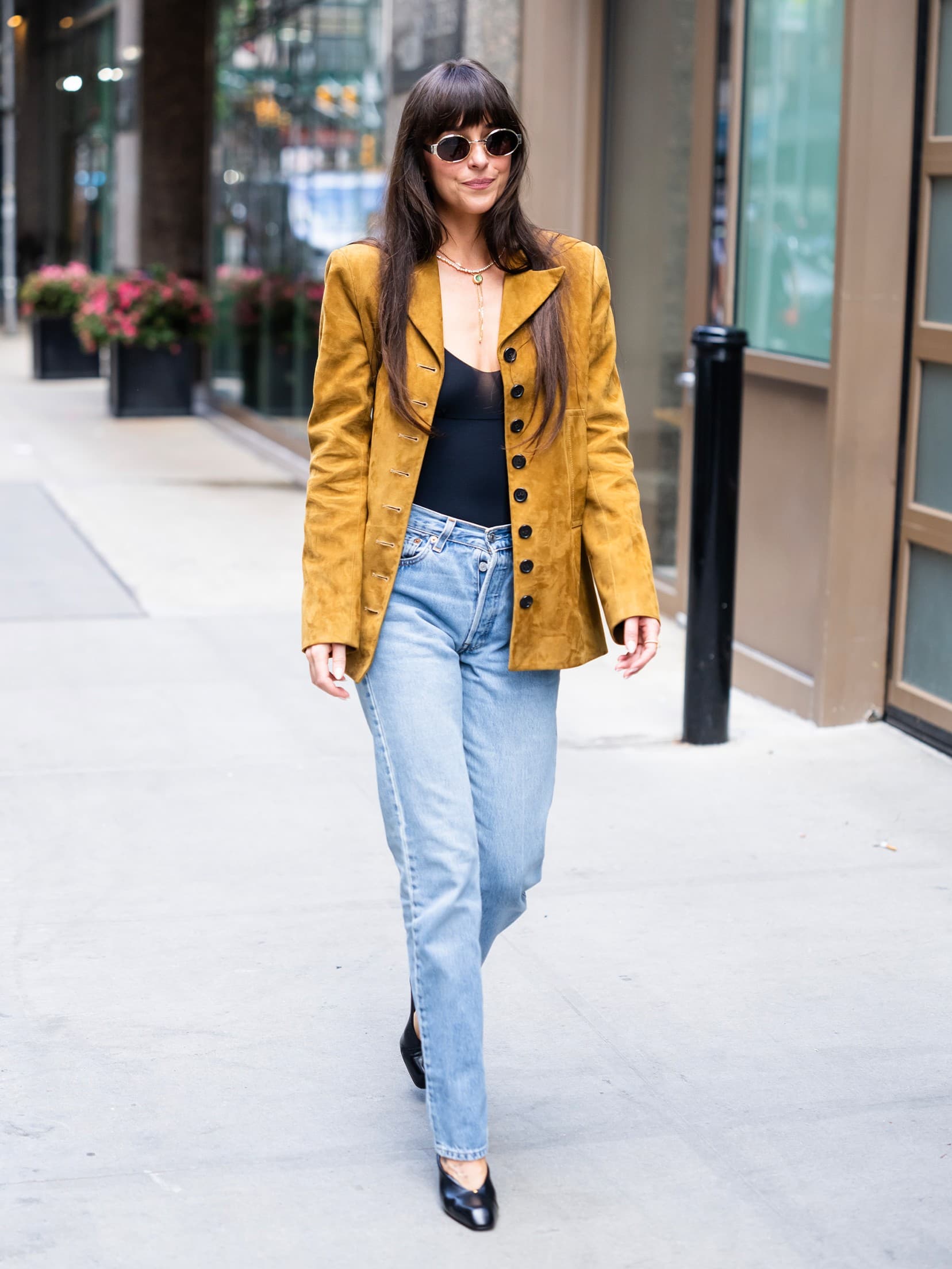 TheStewartofNY / Getty ImagesLast Friday, Johnson was spotted walking in Midtown wearing jeans and a bodysuit from Commando, tying the black base together with pumps and sunglasses. She dressed it up with a caramel-colored suede Khaite blazer and necklace stack, complete with an emerald necklace from Ophelia Eve and tennis necklace from Sophie Bille Brahe.