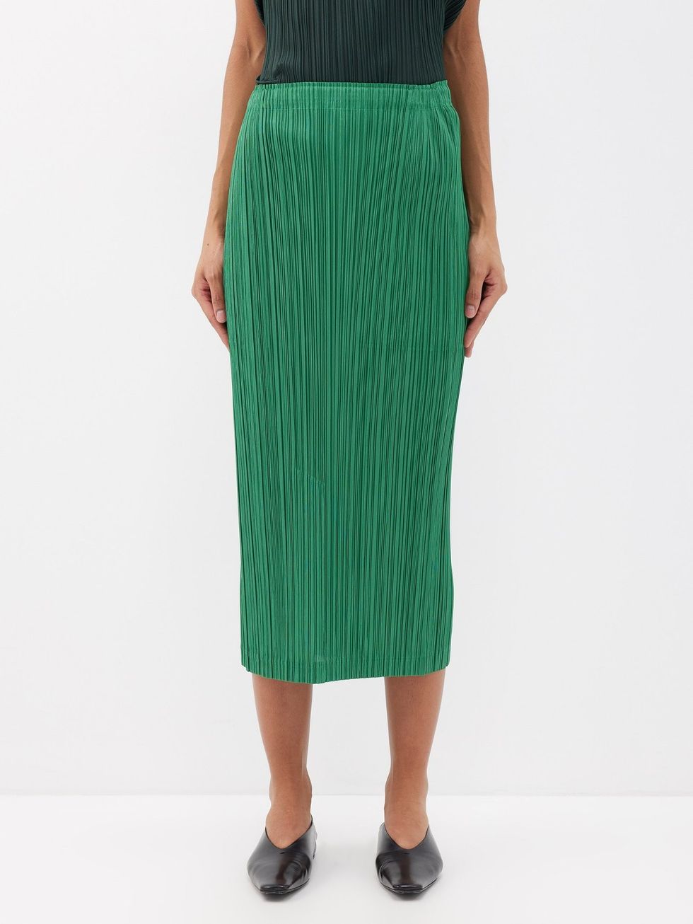 Scarf Top + Plisse Skirt + Loafers