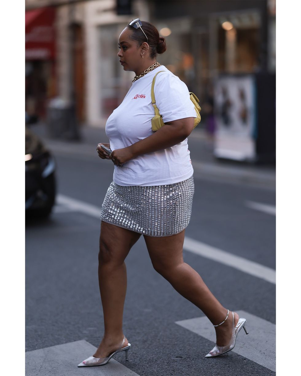 Temper an embellished mini skirt with an oversized t-shirt–sporting your favorite band or logo can serve as a subtle icebreaker. Add a pair of lady-like kitten heels to make it feel polished.