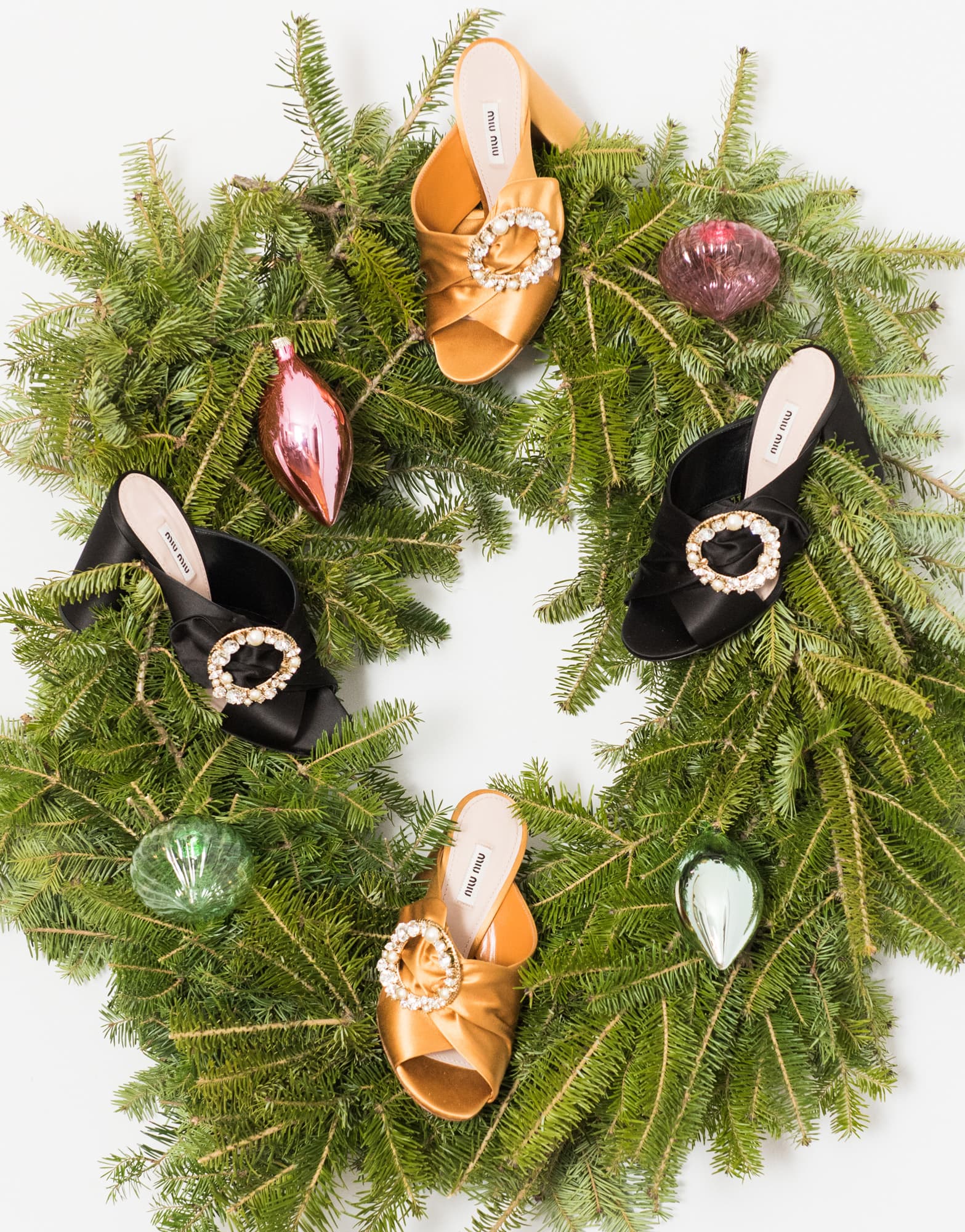 We’ve never seen shoes better suited to decking out a wreath than satin mule slides with a pearl-and-Swarovski-crystal buckle.We’ve never seen shoes better suited to decking out a wreath than satin mule slides with a pearl-and-Swarovski-crystal buckle. The ribbons that accompany those Miu Miu flats that everyone in fashion has been collectively losing their mind over for the last several months are an ideal substitution for twinkle lights.