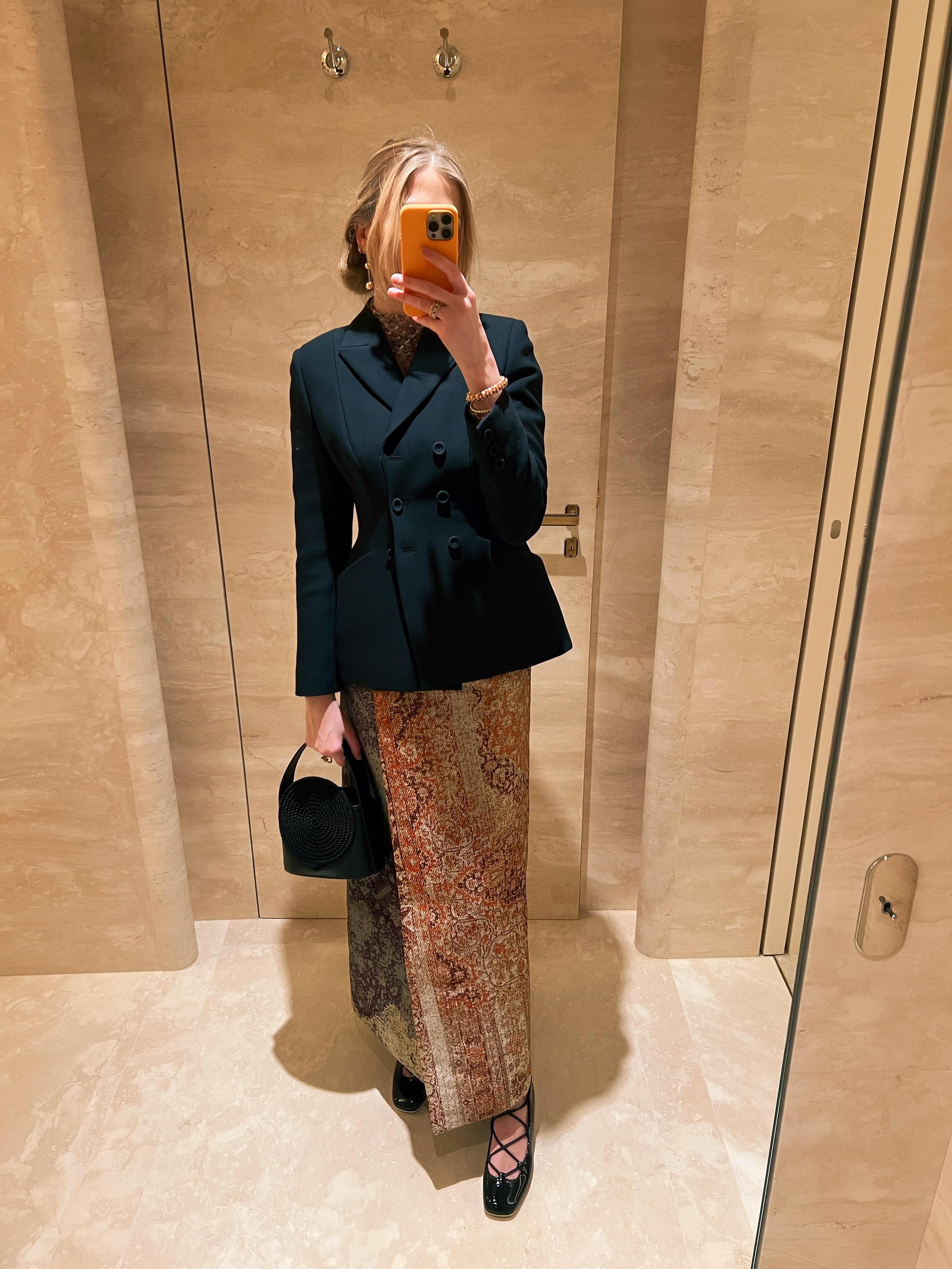 Photo: Courtesy of Geraldine Guyot“I’m wearing head-to-toe Dior on my way to the opening of the new Dior store in Paris. The skirt is from last season’s couture show, which I paired with one of my all-time absolute favorite items: the bar jacket. My black Gunther bag finished up the look.”