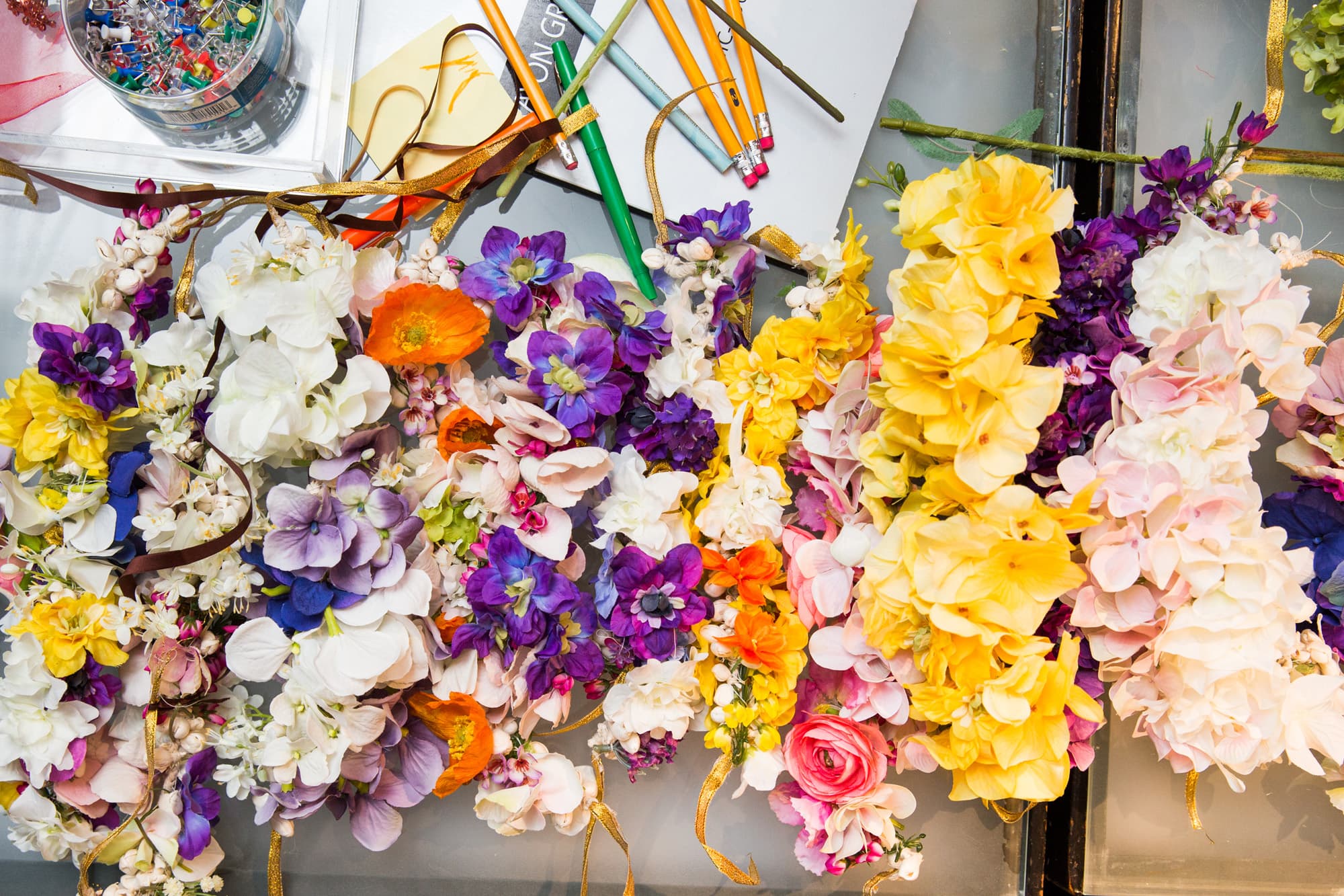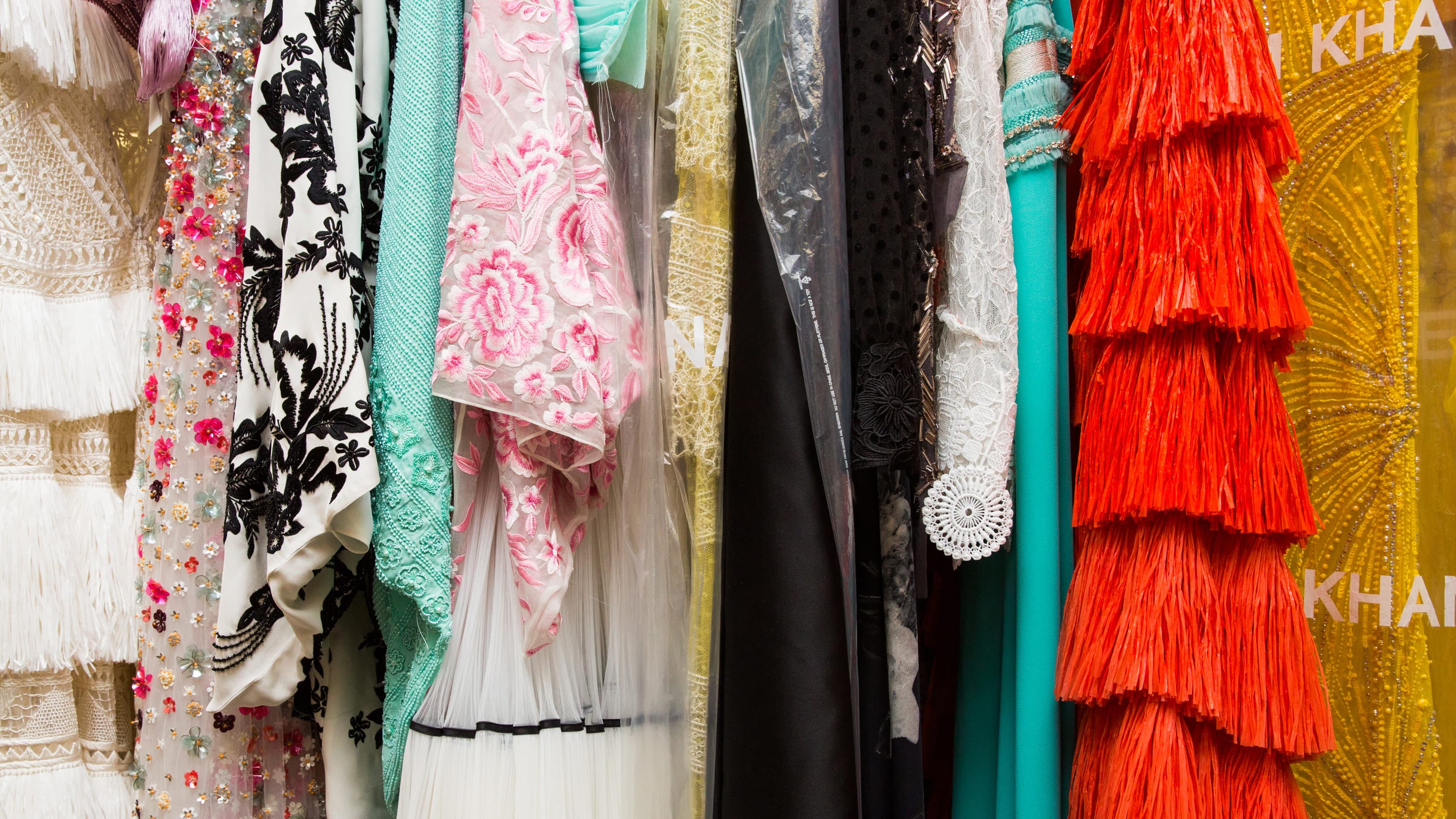 As our interview comes to an end and the designer reflects on his latest New York Fashion Week show and upcoming bridal collection, the inspiration for this season soon becomes apparent. “Ballet,” he confirms as another rack of show-stopping gowns rolls past us. A crew of assistants are sewing tulle straps to custom Christian Louboutin shoes at a table nearby, next to a stack of intricate handmade flower crowns. “It’s not that I’m doing ballerina kinds of clothes, but taking inspiration from there. The clothes—they’re airy, light, colorful. The idea [is], ‘How do you make [clothing] feel like you’re wearing air?’” Just a few days later, as I’m watching a tea-length organza gown float down Khan’s glittering runway, it does seem every bit like magic.