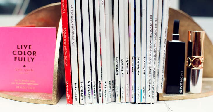 "I had left Teen Vogue, and I went to Kate Spade. The job at Kate Spade was a really huge position—I oversaw all creative aspects of the brand, from copy and the voice of the brand to campaigns, packaging, social media, in-store, windows; a huge responsibility. When you're in these managerial positions, you do lose a little bit of the joy and of the craftsmanship. It's not like I sit [at Lucky} and do layouts, I work through my Art Director and Art Department, but I do enjoy having that rhythm of having four weeks to put something together. It's about baby steps. That's something I was missing a tiny bit with the job at Kate. In magazines, you're not making as much money. But in a corporate environment, everything you do is tracked. Every [newsletter], whether it's for a shoe sale, or a bridal shop opening, the results really get... tracked! You try something once and if it's not succeeding right away, the idea is, 'that didn't work, let's move on, let's go back to what we did last year'."