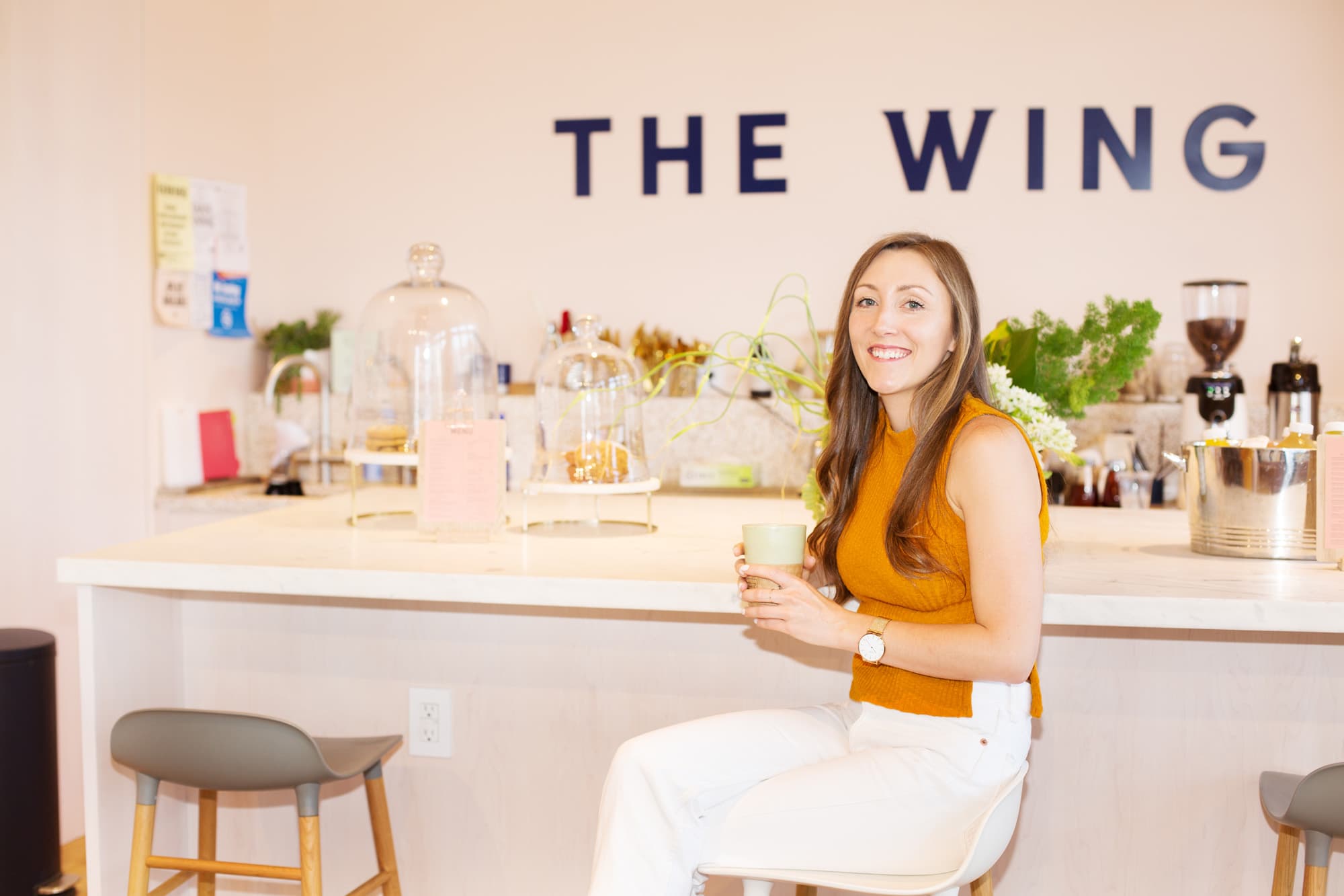 Settling into one of the plush couches in The Wing’s Flatiron outpost on a busy Monday morning looks something like this: Dozens of sharply dressed women type away at laptops and scribble in aesthetically pleasing notebooks. Everything is calm and orderly, efficient and stylish. The same can be said of Deva Pardue, the graphic designer behind For All Womankind, with whom we meet on said Monday morning. She expertly guides us through the social club space, pointing out subtle details like the custom “W” tiles in the bathroom. “I designed those,” she drops casually as we step closer to inspect the gorgeous inlay. In fact, as an integral part of the all-female team from design firm Pentagram, she helped design every inch of The Wing’s delicately feminine brand identity. “It wasn’t a difficult project. We loved the idea from the beginning. I think your work is always better when you’re passionate about it and feel like it’s worth something.”