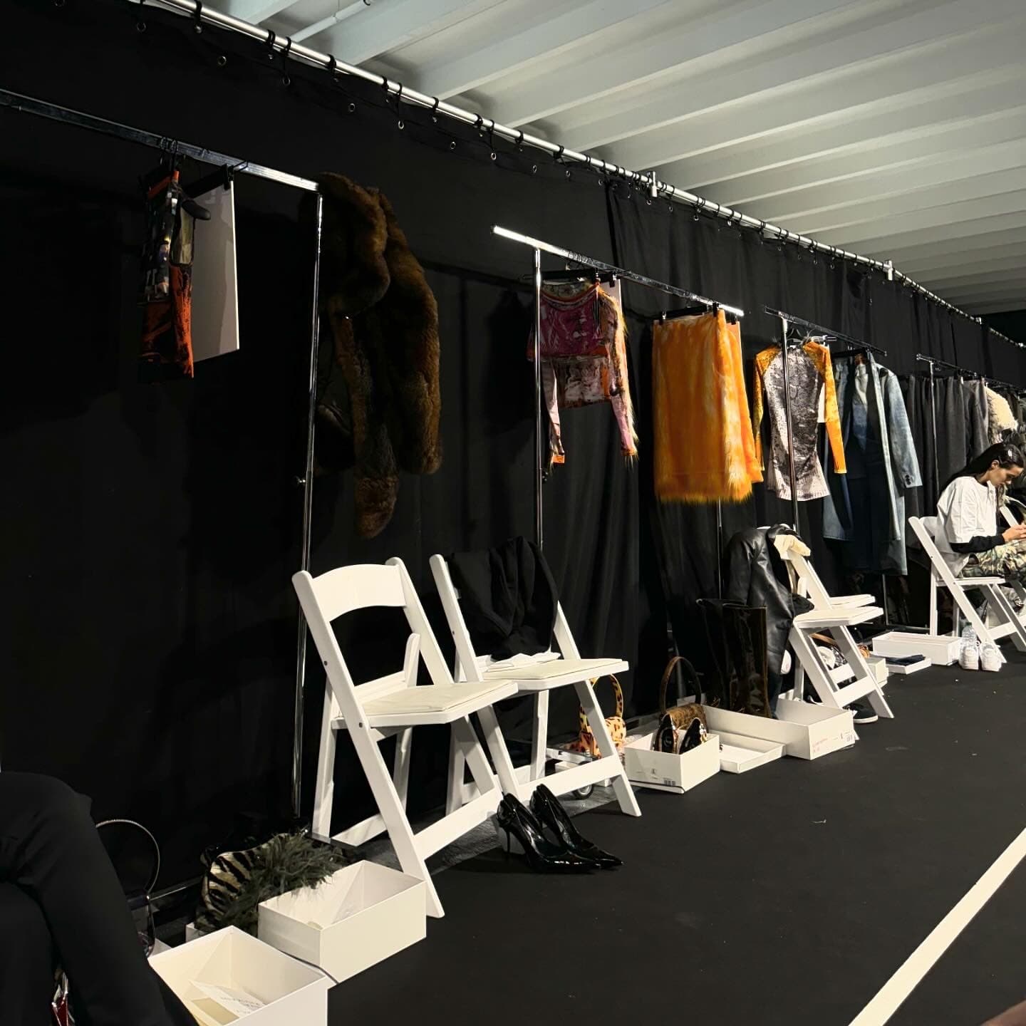 10 AM: This is home base. This is where you sit until rehearsals start. I love the stations that were set up for each model. We were each given a white tee that has the little Diesel logo on it for rehearsals—so cool.
