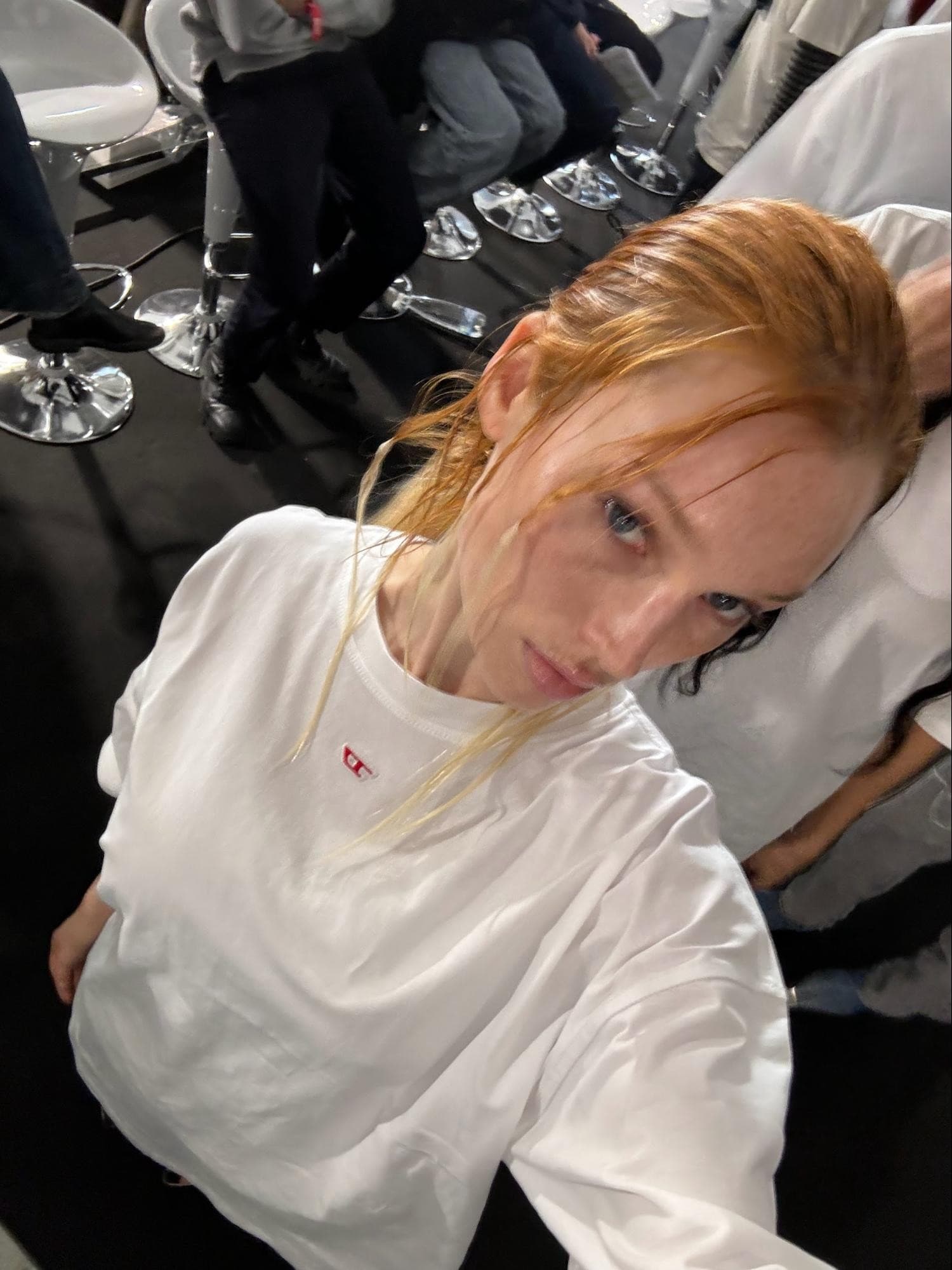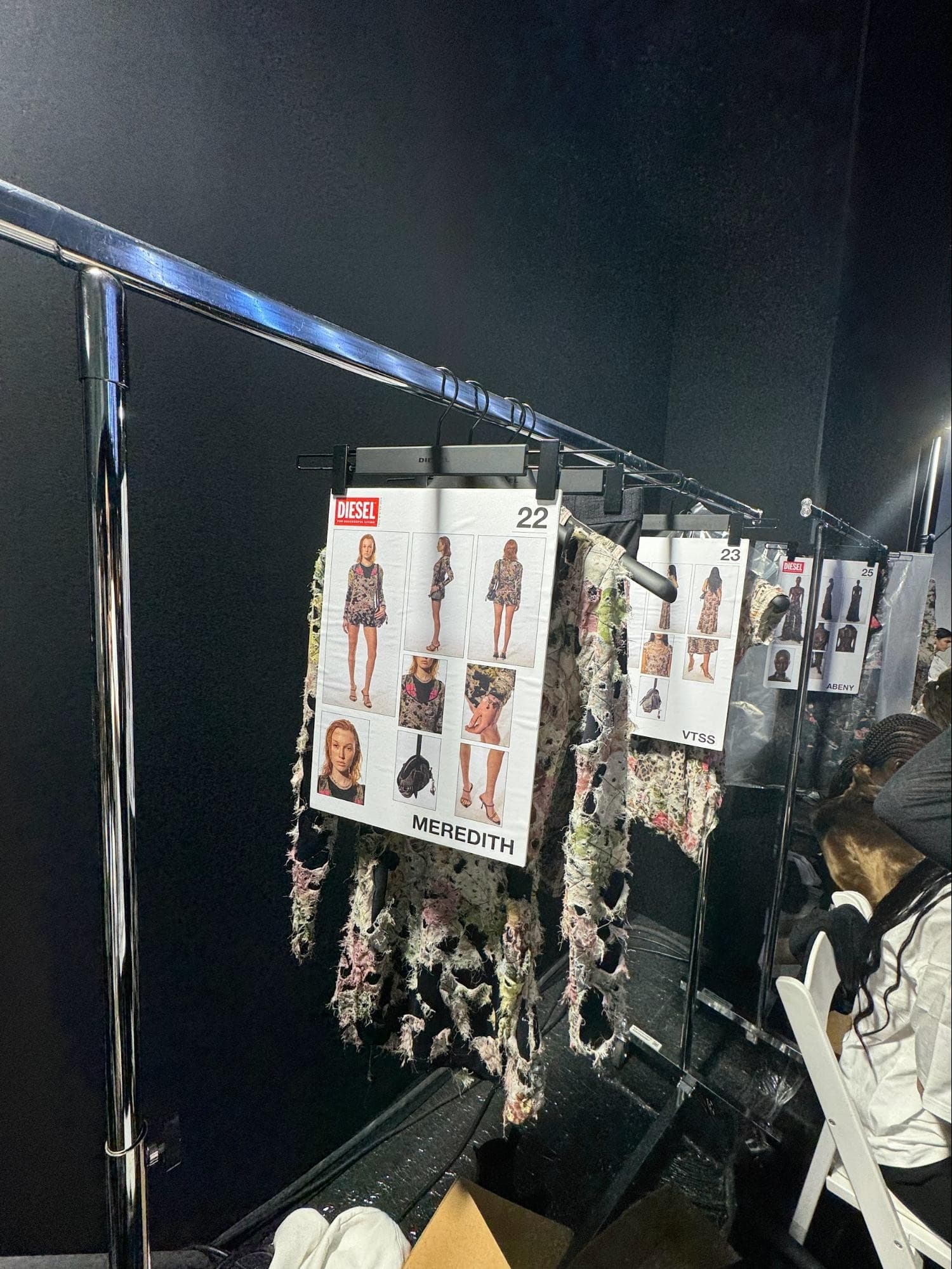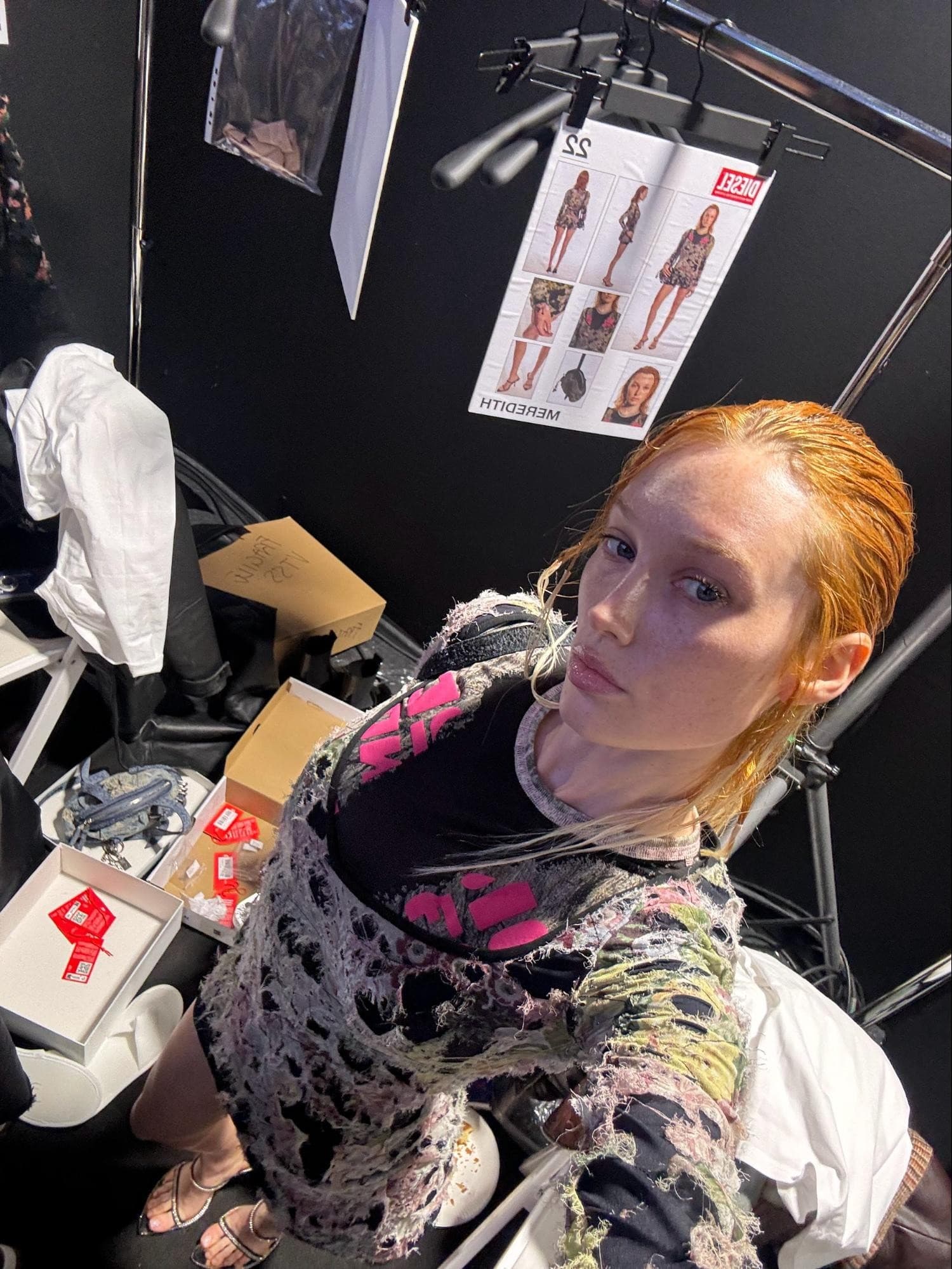 There are fashion shows and then there are Glenn Martens fashion shows, a notion not lost on model Meredith Duxbury. This Fall 2024 season, she was cast to walk the aforementioned creative director’s Diesel fashion show—a highly coveted ticket. No surprises here, the glam, the movement direction, and the set were as riveting as the designs themselves. Luckily, Duxbury cataloged every minute of it for us, from the t-shirt she was given for hair and makeup, to the runway rehearsal, to the final catwalk.