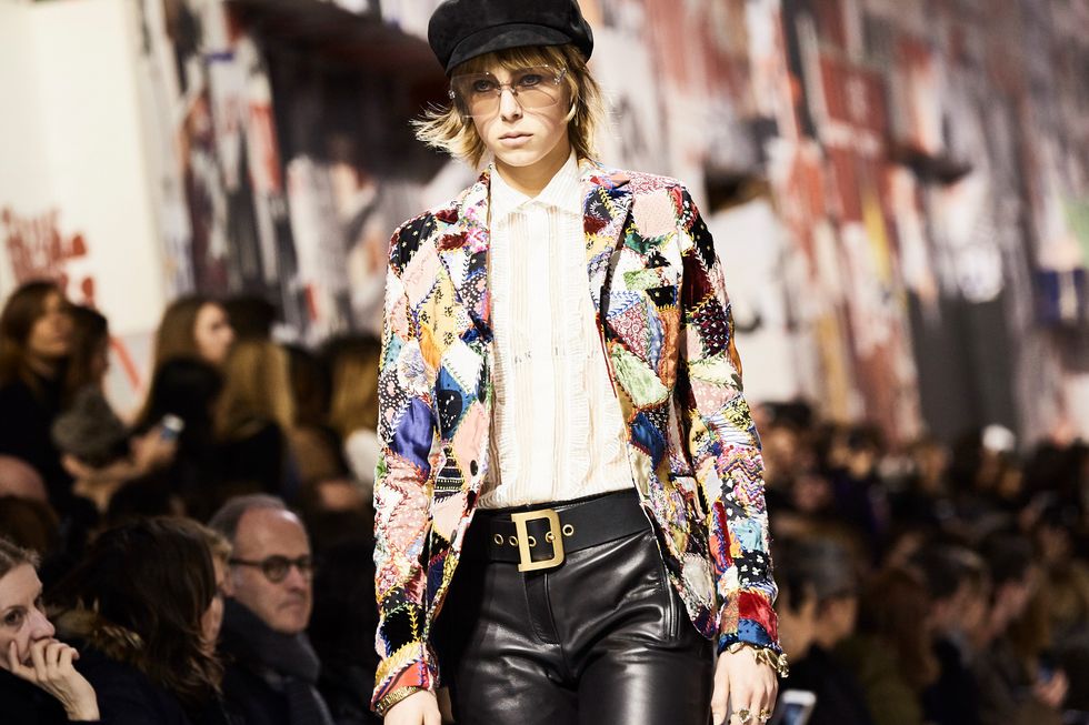 Models walked down a set completely collaged with posters, women’s magazine tear sheets from 1968, and feminist slogans including “Women’s rights are human rights.” Ruth Bell opened the show with a slogan knit stating, “C’est non, non, non et non,” setting the tone for strength and rebellion. Gone are Chiuri’s sheer romantic ballerina-length dresses and branded kitten heels; in their place were kilts in varying lengths with matching jackets, ponchos, long tulle skirts with lace detailing worn with masculine wool jackets, and heavily embroidered maxi-dresses. Footwear was strong and practical: thigh-high boots with stacked heels and clogs—perfect for stomping through the streets of Paris with the brand’s iconic saddle bags in tow. Patchwork was seen on jackets, dresses, and mini-skirts paired with buttery leather moto jackets. Denim, a traditionally working-class fabric and a favorite of Chiuri’s, came in various guises from patchwork coats to cropped pants with embroidered detailing. Hemlines were noticeably shorter this season, and this gave nod to the 1966 protest outside the Dior boutique in Paris, when women held signs demanding “Mini Skirts Forever.”