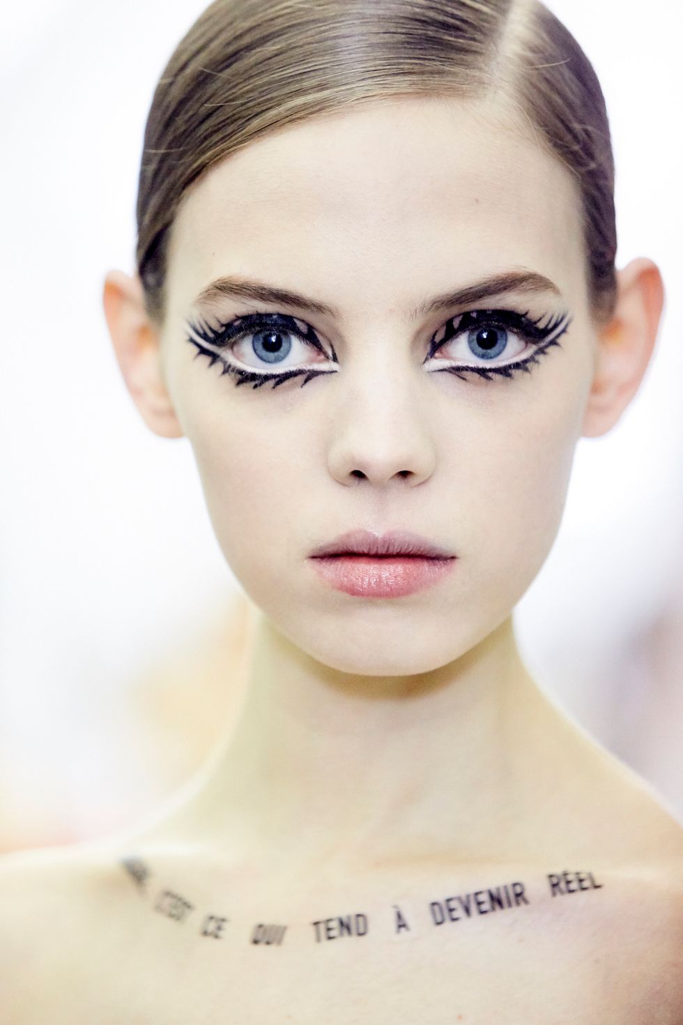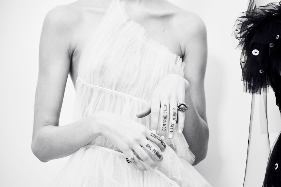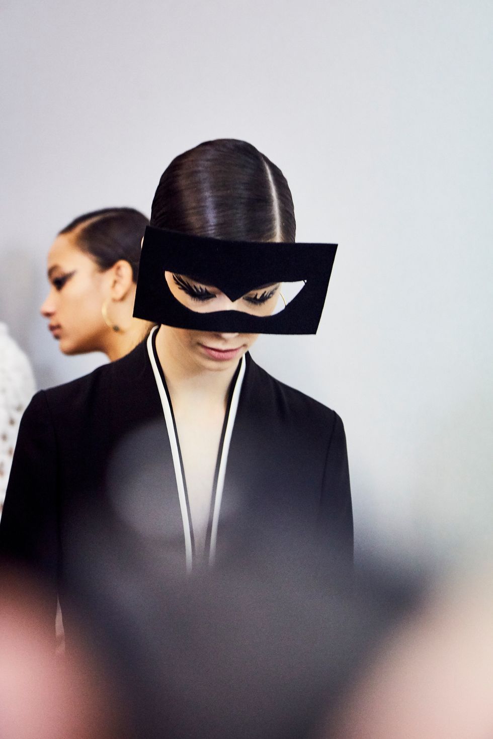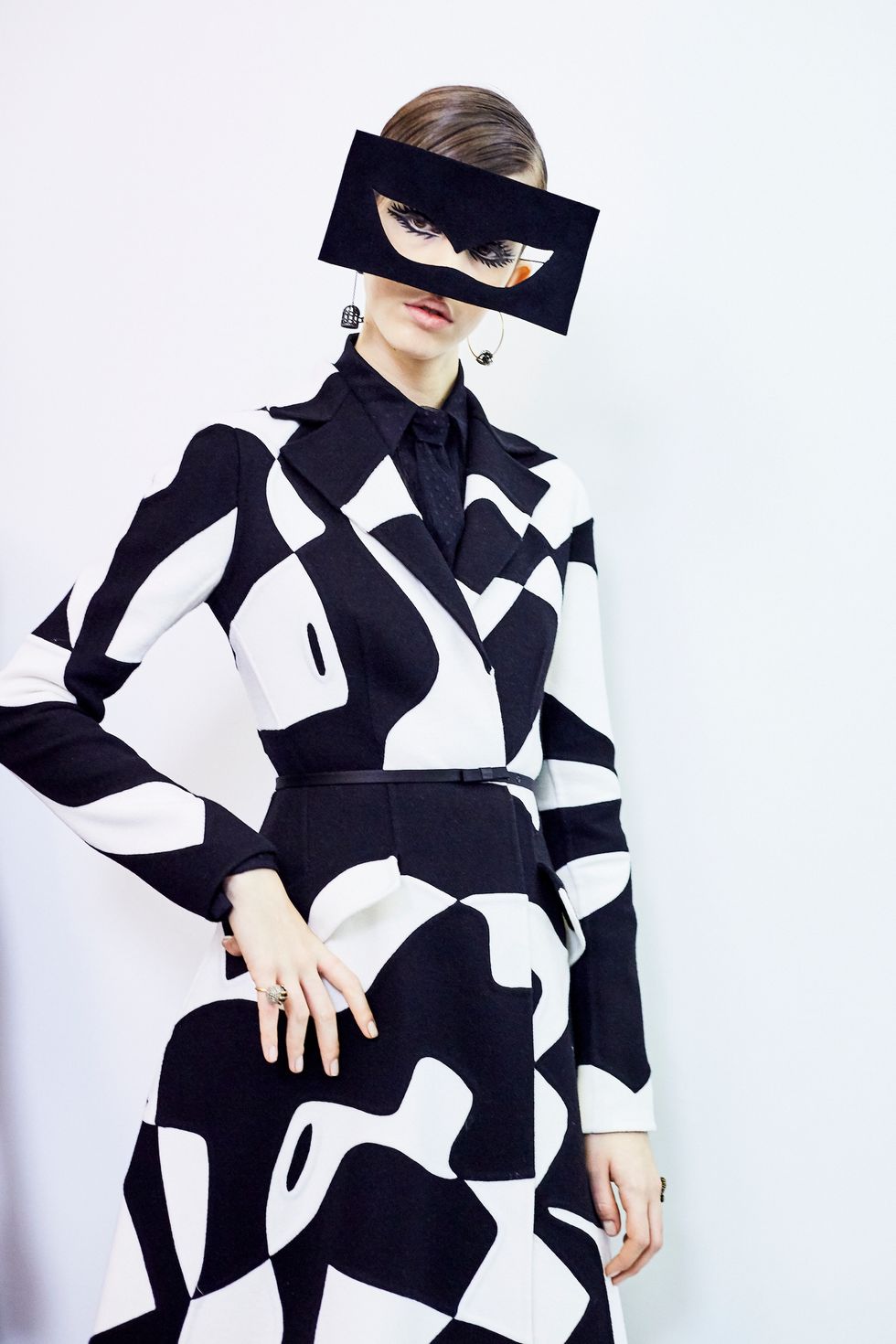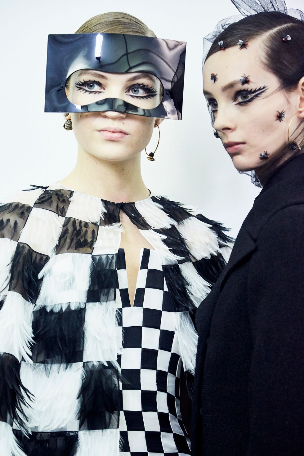 Models walked down a checkered catwalk, giving a nod to Man Ray’s chessboard, with supersized plasters of random body parts dangling above. Several of the models wore masks created by Stephen Jones that covered the face but revealed the eyes, while others had surrealist-inspired tattoos that adorned collarbones and fingers. Peter Philips, creative director of Dior makeup, created a strong eye with loosely drawn lashes to complement the masks, while hairstylist Guido kept the hair sleek and tied back.