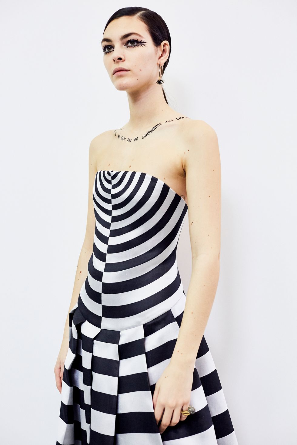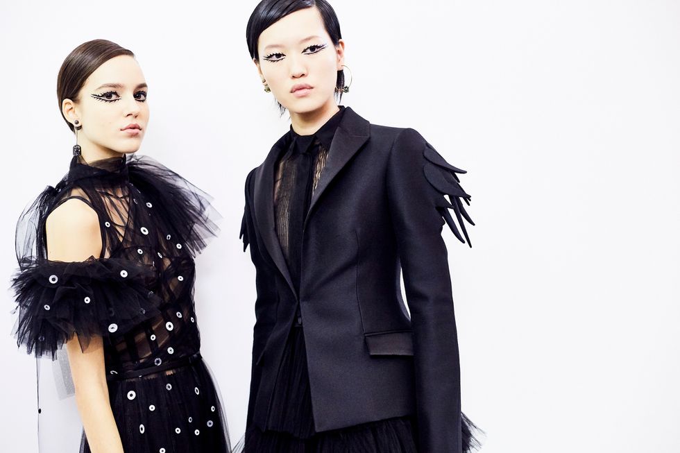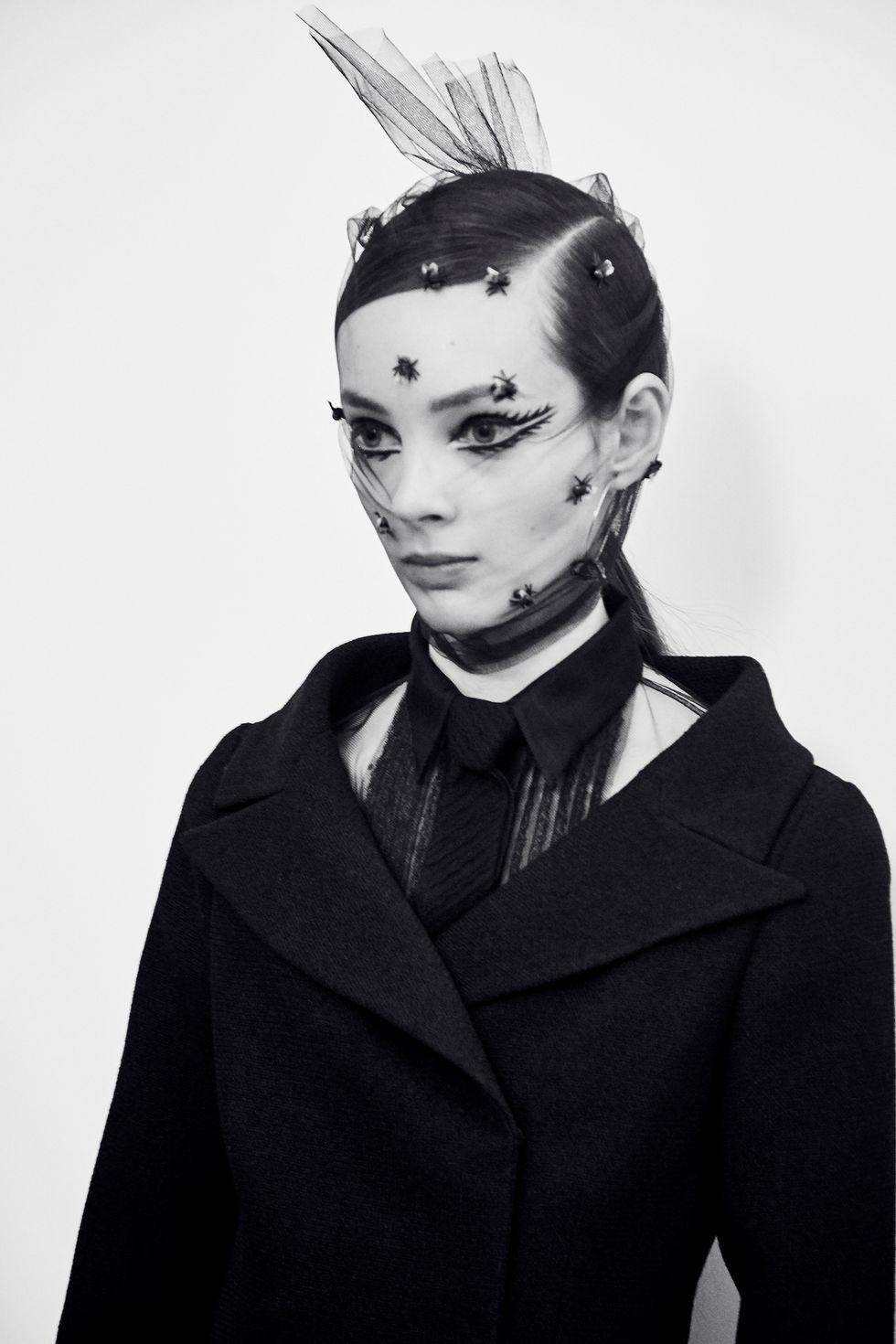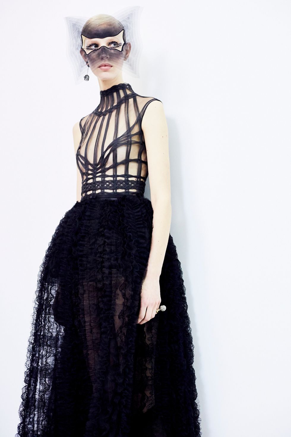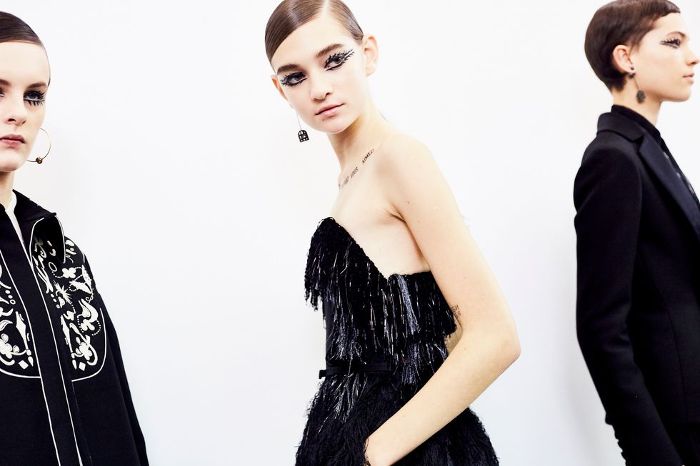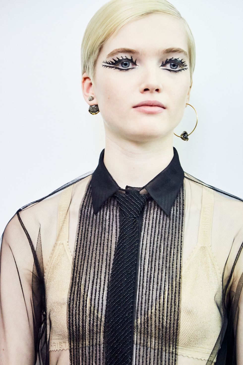 Models walked down a checkered catwalk, giving a nod to Man Ray’s chessboard, with supersized plasters of random body parts dangling above. Several of the models wore masks created by Stephen Jones that covered the face but revealed the eyes, while others had surrealist-inspired tattoos that adorned collarbones and fingers. Peter Philips, creative director of Dior makeup, created a strong eye with loosely drawn lashes to complement the masks, while hairstylist Guido kept the hair sleek and tied back.