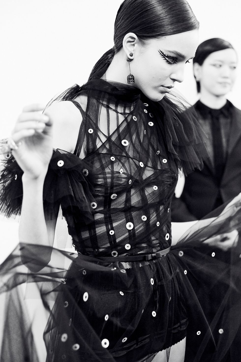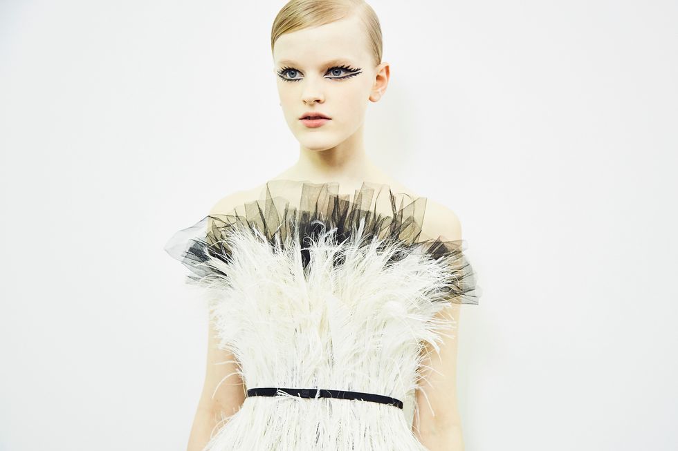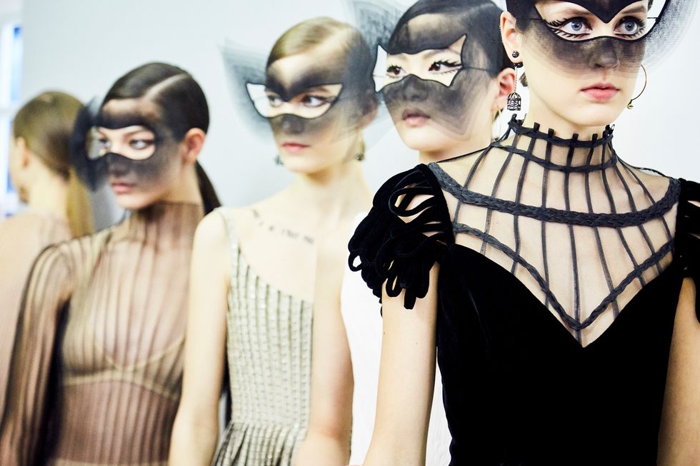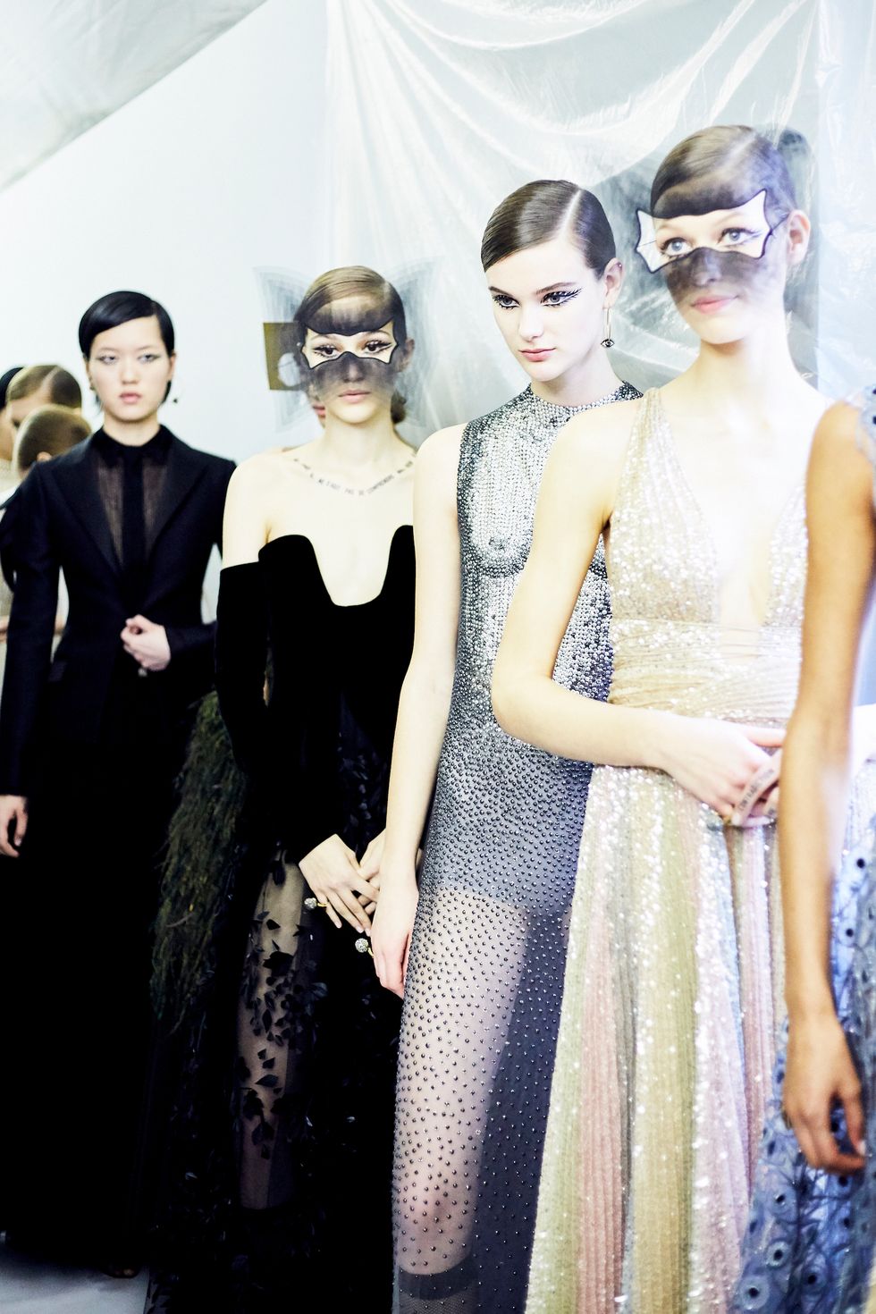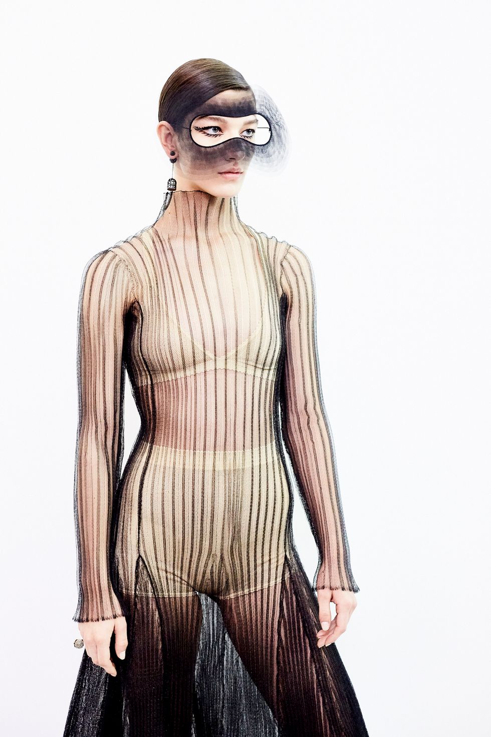 Models walked down a checkered catwalk, giving a nod to Man Ray’s chessboard, with supersized plasters of random body parts dangling above. Several of the models wore masks created by Stephen Jones that covered the face but revealed the eyes, while others had surrealist-inspired tattoos that adorned collarbones and fingers. Peter Philips, creative director of Dior makeup, created a strong eye with loosely drawn lashes to complement the masks, while hairstylist Guido kept the hair sleek and tied back.