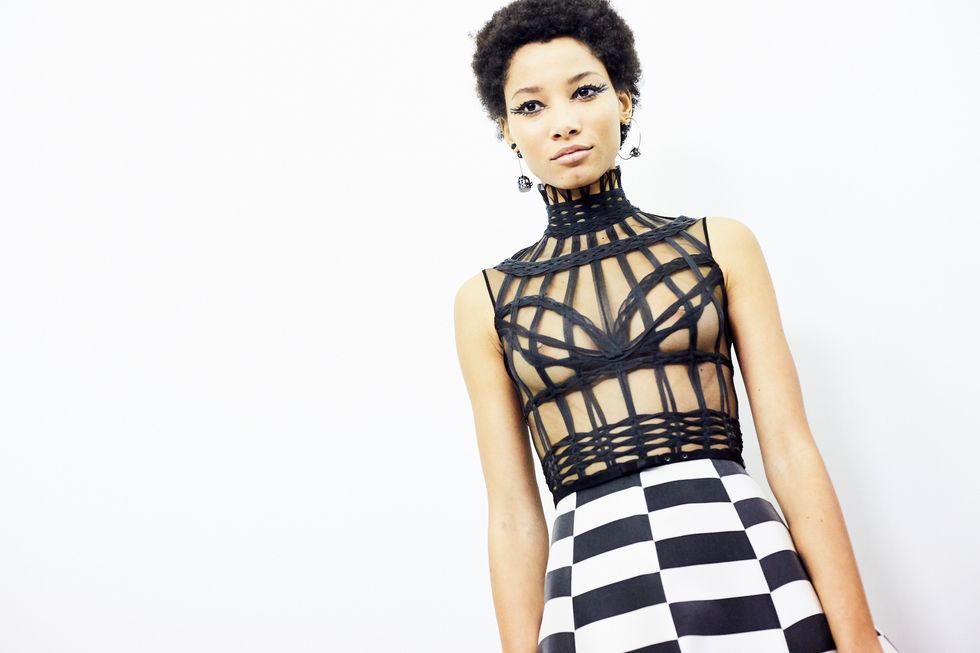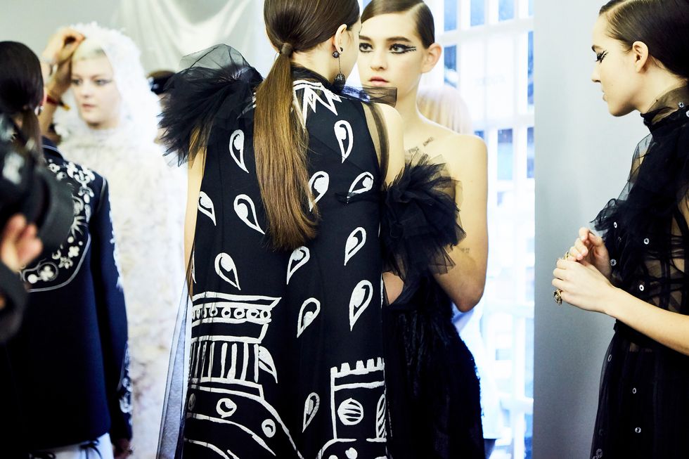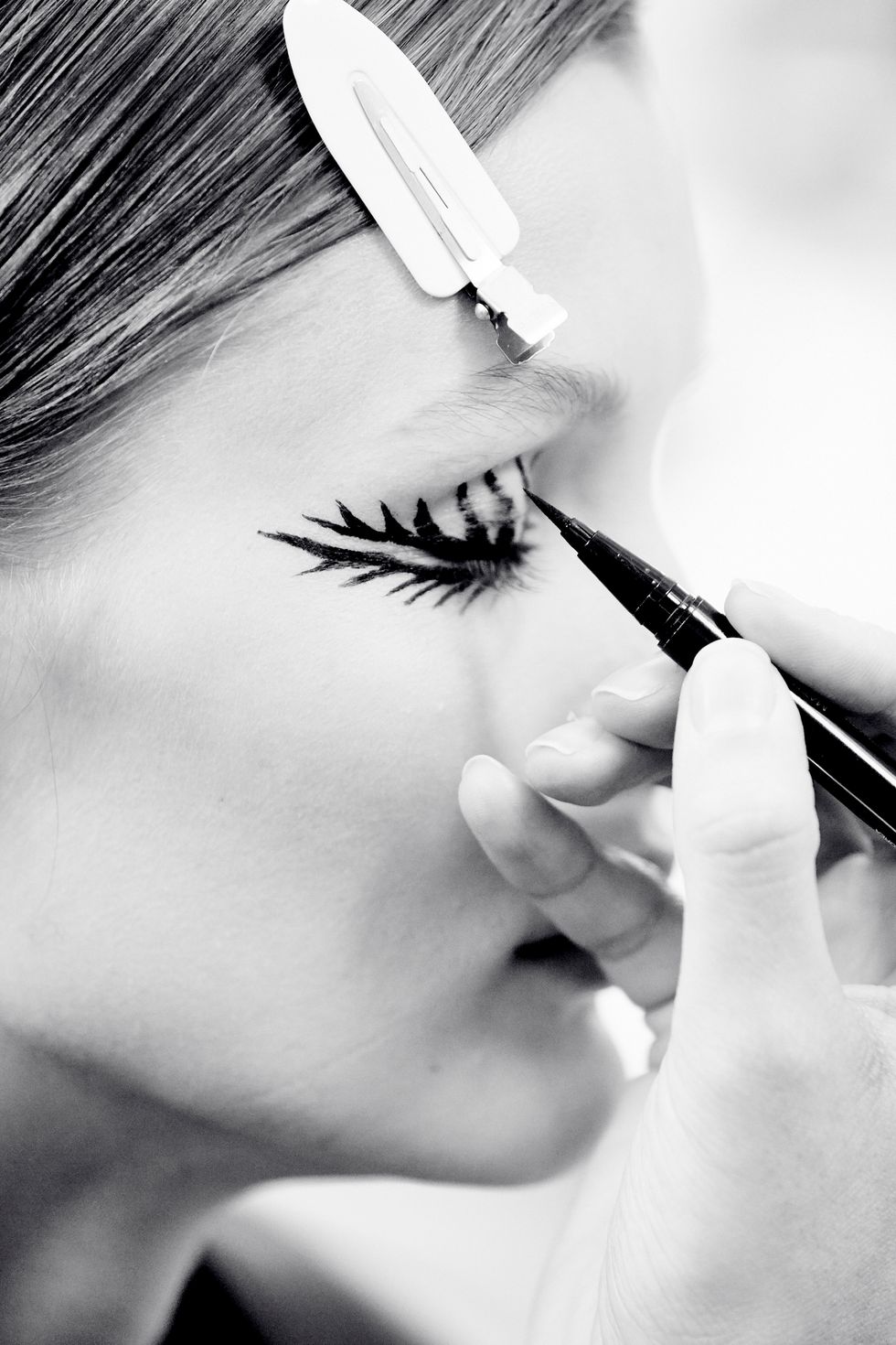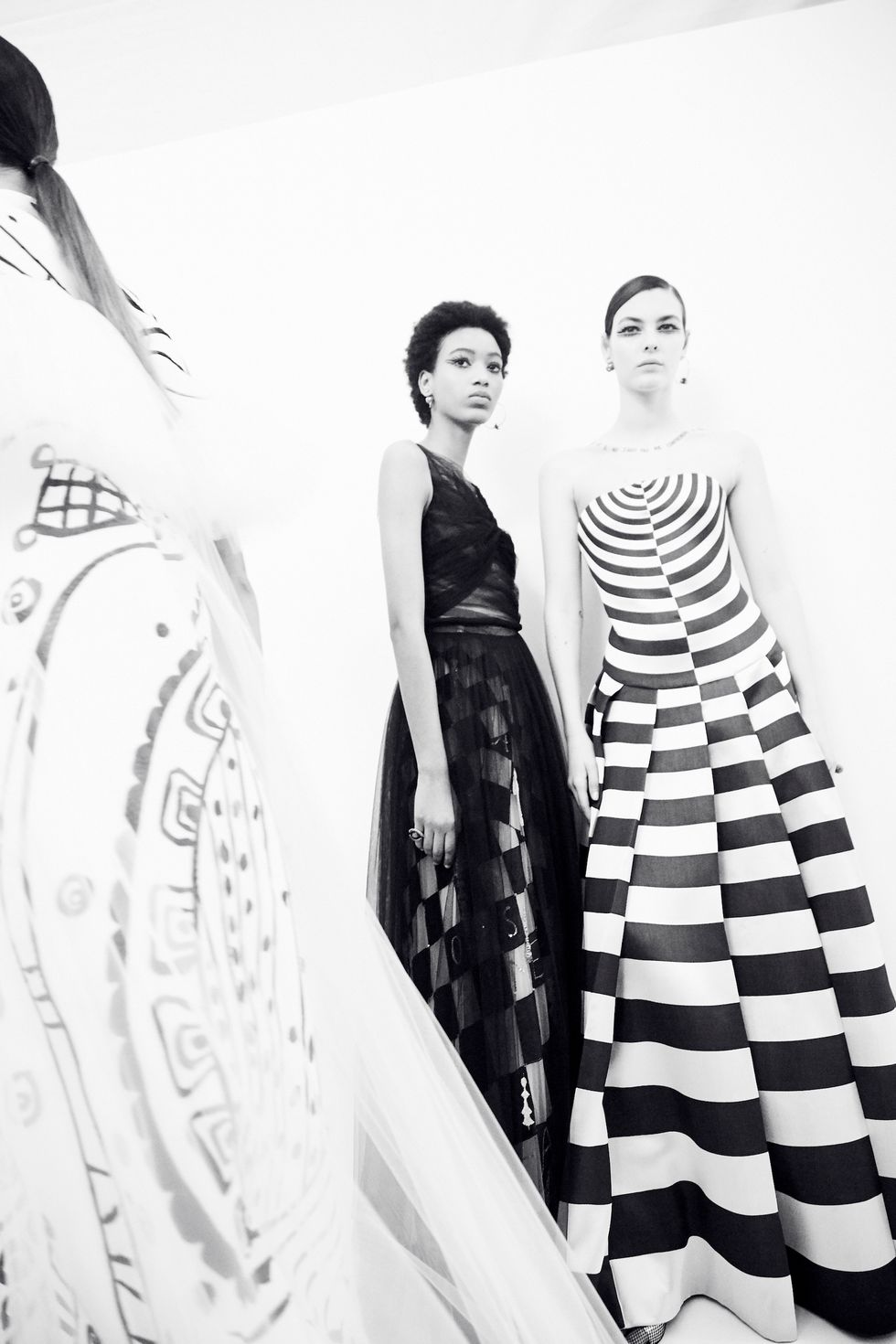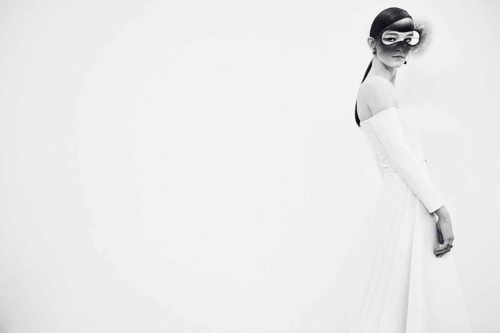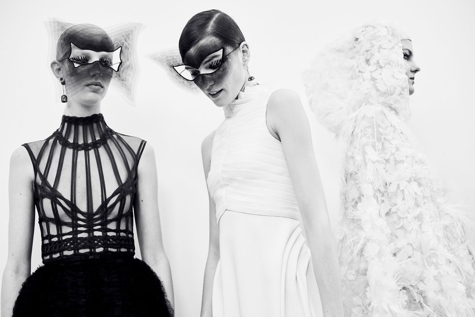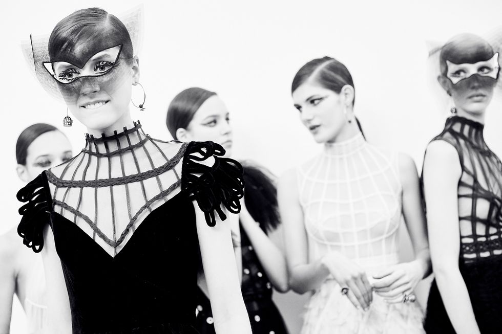 Models walked down a checkered catwalk, giving a nod to Man Ray’s chessboard, with supersized plasters of random body parts dangling above. Several of the models wore masks created by Stephen Jones that covered the face but revealed the eyes, while others had surrealist-inspired tattoos that adorned collarbones and fingers. Peter Philips, creative director of Dior makeup, created a strong eye with loosely drawn lashes to complement the masks, while hairstylist Guido kept the hair sleek and tied back.