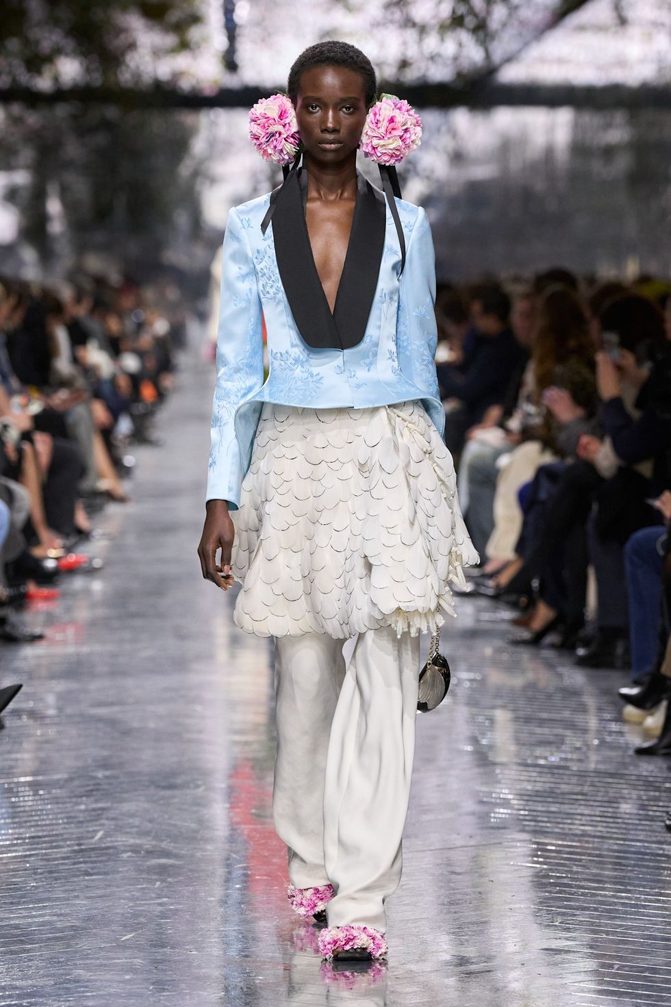 The first three exits were a clever extension of what we saw play out at Spring/Summer 2026: pleated bubble dresses with structured crinolines that had been elongated for couture. Each model balanced a string of lilac orchids on her shoulder, a motif that would continue for almost all 63 exits. If it wasn’t an orchid, it was twin bunches of cyclamen in varying pinks and whites positioned just below the lobe of the ear. Were they earrings or hair accessories?