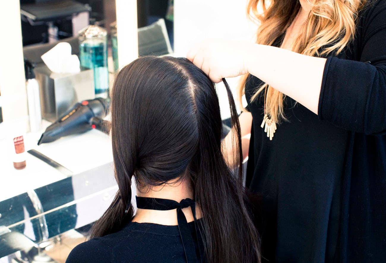 4. To get rid of any bumps or lines from severe partings take the end of a tail comb and gently slide back under the hair. This will help create a smoother look. Finish the look with some of Shu Uemura's Sheer lacquer to tame any flyaways and add some incredible shine!