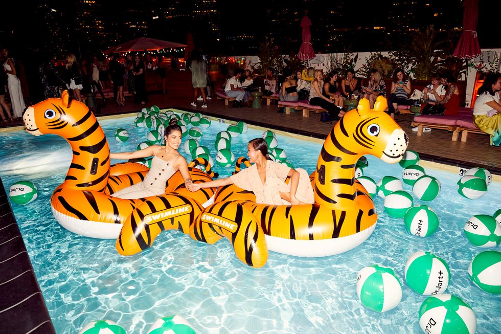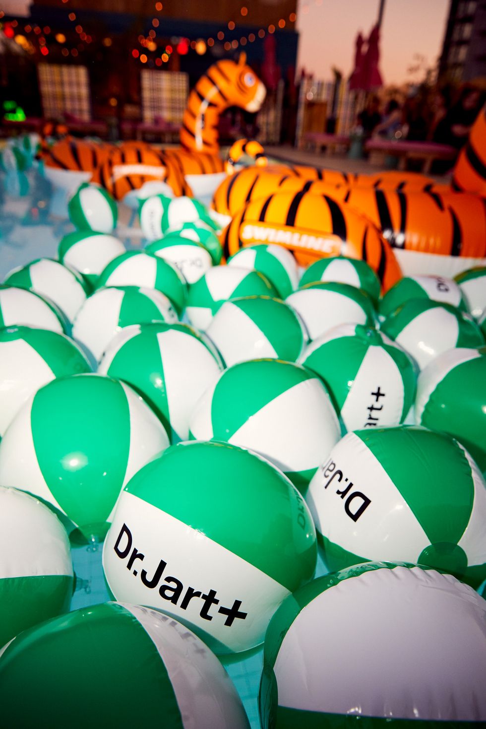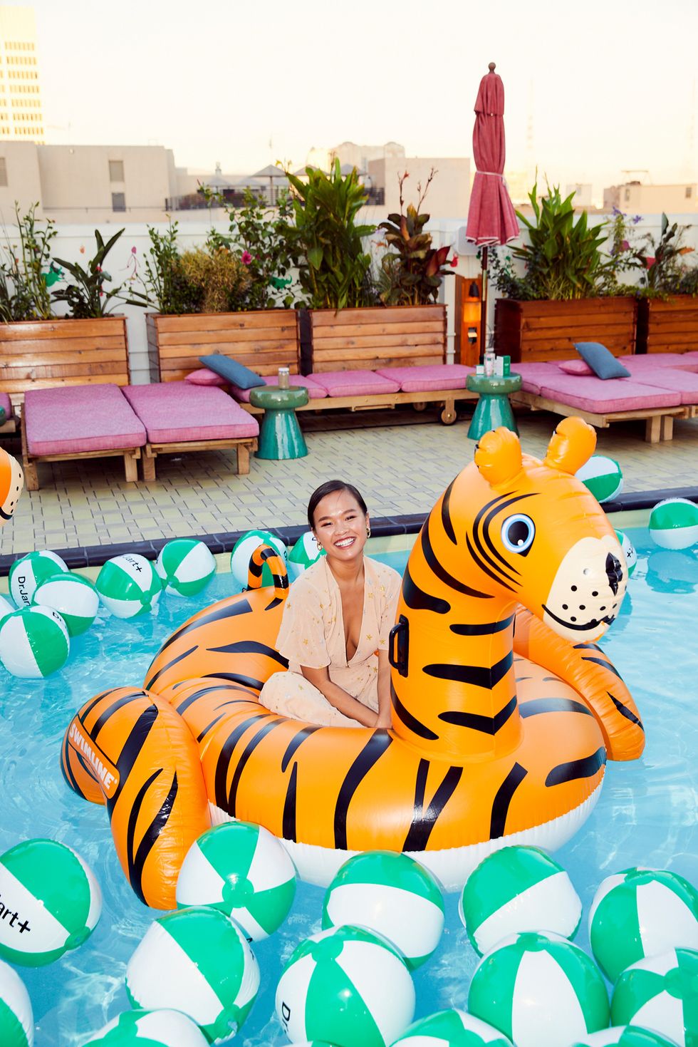 Picture this: a rooftop with a pool full of beach balls and inflatable tigers, a lightbox photo wall, and a claw machine, all in the middle of a jungle-themed party. This was *exactly* the scene on the rooftop of the Freehand Hotel in downtown L.A. Tuesday night at our party with skin-care brand Dr. Jart+. Our incredible co-founder Stephanie Mark hosted, the amazing Brittany Sky was our DJ (because of course), and we had all the guests sippin’ on tiger-themed cocktails. Chic, no?