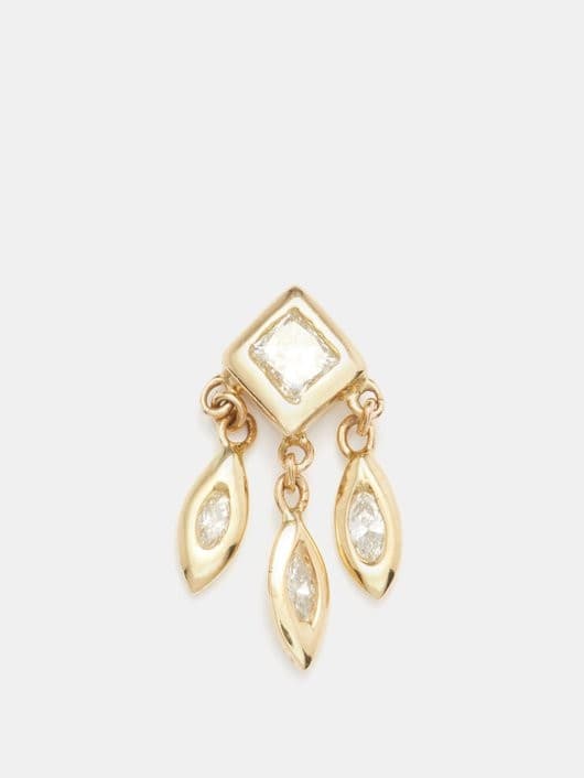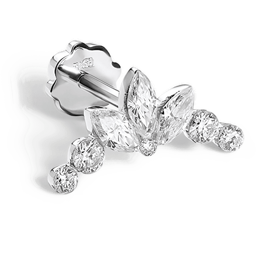 AS Tash is the queen of versatility, we asked her where to start when deciding between minimalist pave huggies, diamond studs, or simple solid gold hoops to pair with the pieces we already have. She shares, “I recently introduced threaded piercing charms in pear and marquise white diamonds. This design is a hybrid because it is a stud that can move like a charm. This design in various sizes and colors of gold can be worn in almost all areas of the ear and pairs really well with my popular invisible set diamond hoop earrings. It's a very modern way to set the diamonds because it has hidden mechanisms to hold the stones with movement, and emphasizes the pure beauty and cut of those popular diamond shapes.