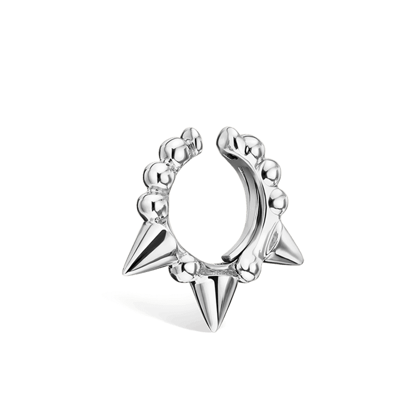 Then, there’s always the question of how to marry a cartilage hoop with a daith piercing or pear shaped diamond drop. It can be overwhelming when adding another piercing into the mix, but, Tash notes, “If the intent is to stick with the Lobe as opposed to cartilage, there are many new types and effects. The old rules of even spacing between Lobe one, two and three no longer exist. One can place a stack on top of a first, second, or third Lobe piercing for a novel effect or place a second or third ear piercing quite far away from a first Lobe to create large spacing. A good curation involves deliberate choices in ring diameters and how studs and rings play off each other. Everything should relate to each other, be readable, and not too busy.