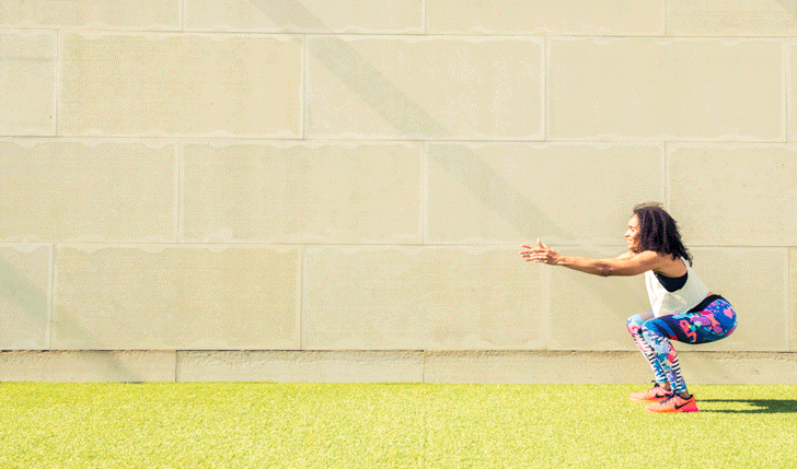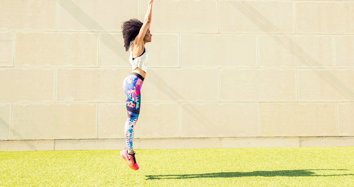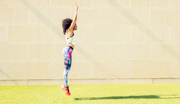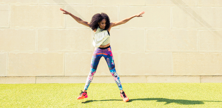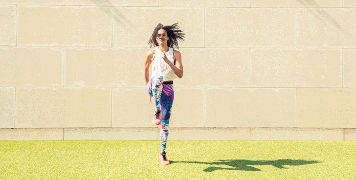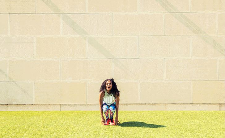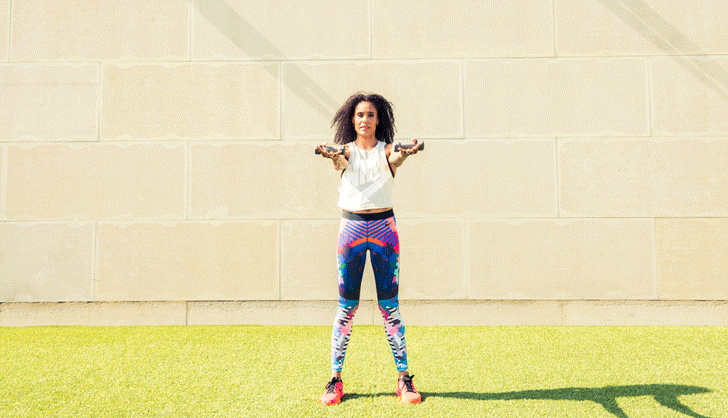 SoulCycle spinmaster, pro-Nike runner, and World Champion in track. Yeah, we know what you’re thinking: She’s effing hardcore. Well, duh, why else would we enlist her to show us the fastest (read: most fun) way to tone up for all those cut-out dresses and bodysuits that are finally weather-appropriate? All you need are a few dumbbells, a really wicked pair of leggings, and to look below. #justdoit