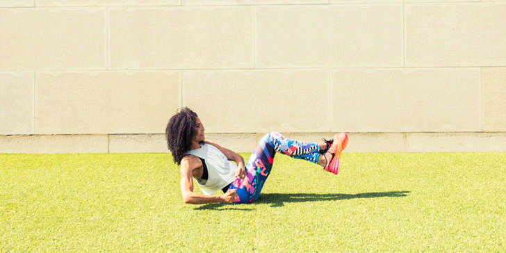 "Sit on the ground, with legs out in front of you. Bend your knees and begin to lean back ever so slightly. Lift your feet off the ground and hold yourself at 60 to 75 degree angle. Have your hands together and rotate the torso back and forth, tapping each side of the floor. You want to make sure you feel a burn not only in your abdominal, but also in your legs. You want to do at least 40 of these. Each time you touch a side with your hands that is considered 1."“Sit on the ground with legs out in front of you. Bend your knees and begin to lean back ever so slightly. Lift your feet off the ground and hold yourself at 60 to 75-degree angle. Have your hands together and rotate the torso back and forth, tapping each side of the floor. You want to make sure you feel a burn not only in your abdominal, but also in your legs. You want to do at least 40 of these. Each time you touch a side with your hands, that is considered one [rep].”