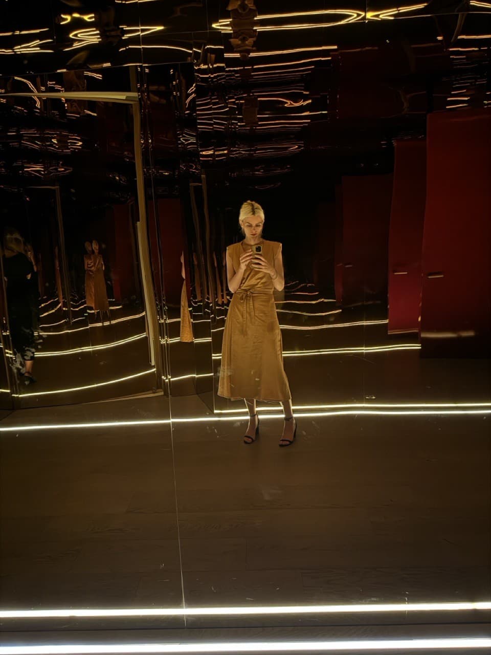 At around 10:30 p.m., we descended the snail-like EDITION staircase and snuck past velvet ropes, where someone whispered that 800 people were waiting to get into the secret unveiling. I knew that feeling; it was the breathless feeling I had while standing in front of doormen at Beatrice Inn, Jane Ballroom, and The Box in my nights of yore—the feeling that anything could happen. We traversed a mirrored portal-of-sorts leading into a dark, cavernous space with barreled ceilings.