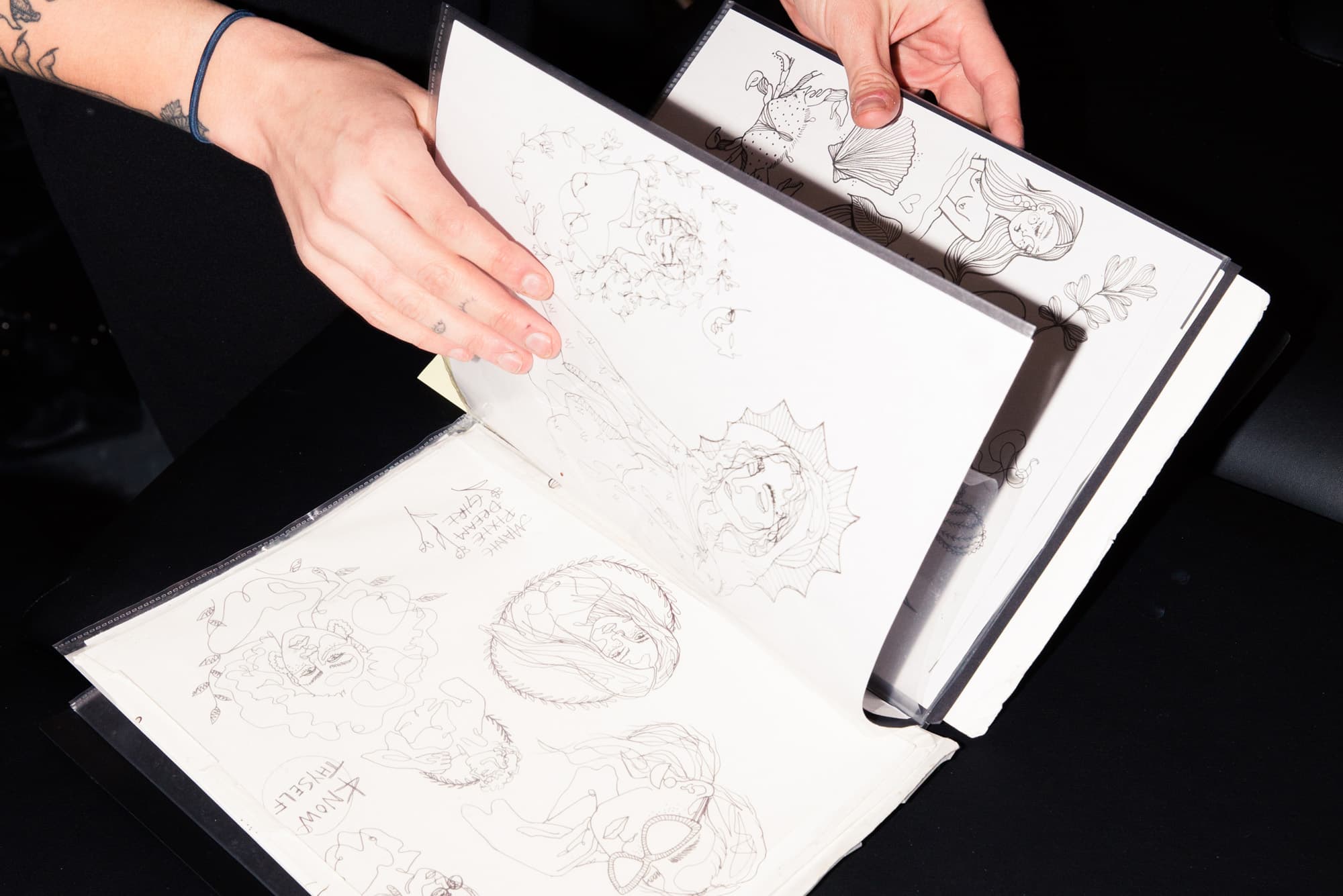 in Williamsburg, Brooklyn. “I think a lot of my tattoos look like little fashion illustrations because they’re that fast sketch style.” Her signature approach is thanks in large part to her background in fashion, but after interning at Betsey Johnson post-FIT graduation and getting recruited to design at American Rag, she eventually left the industry for a year-long tattoo apprenticeship. “I was really not wanting to do fast fashion anymore. [I was] really uninterested in contributing to the impact that has [on] climate change.”