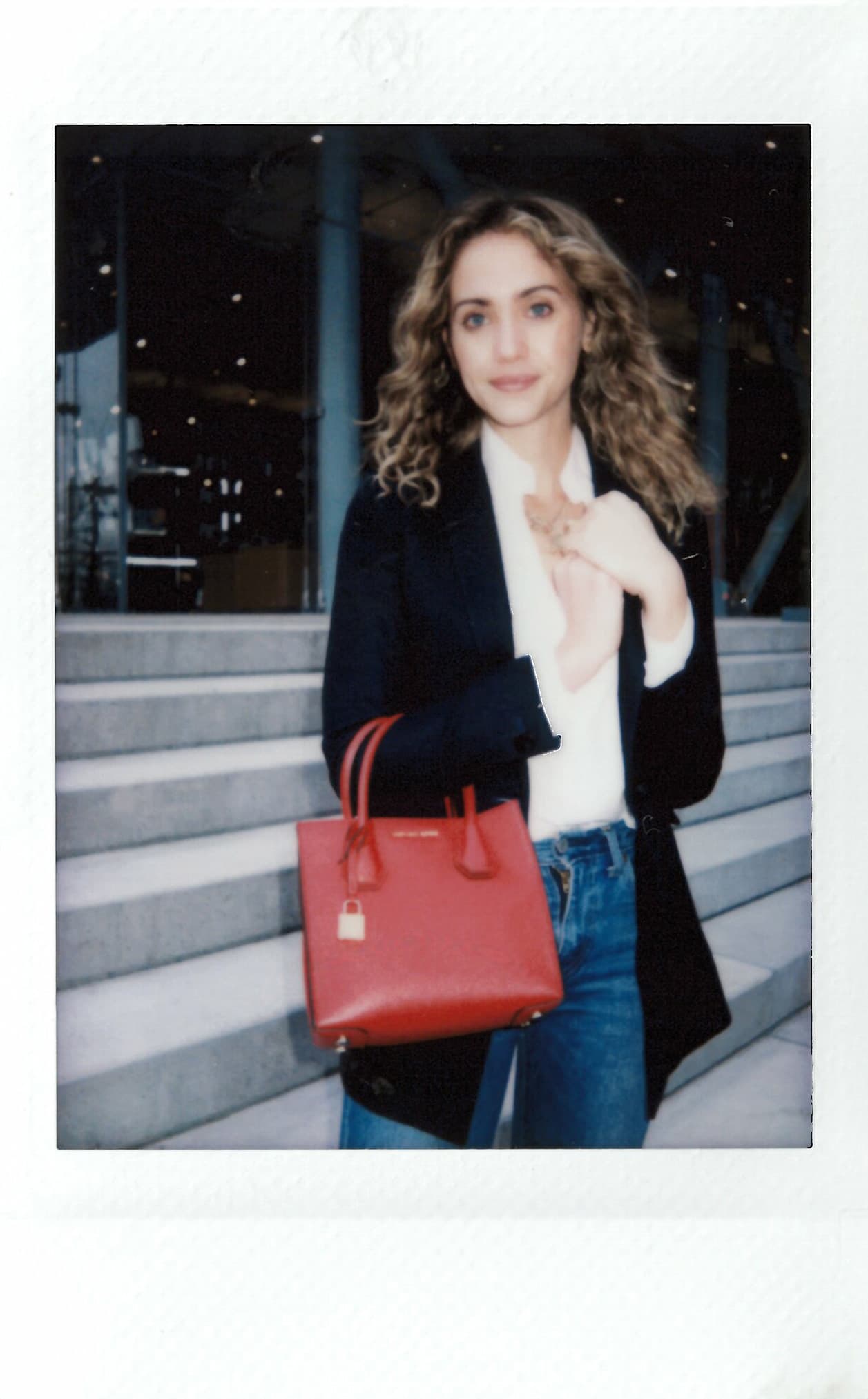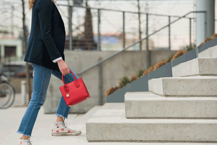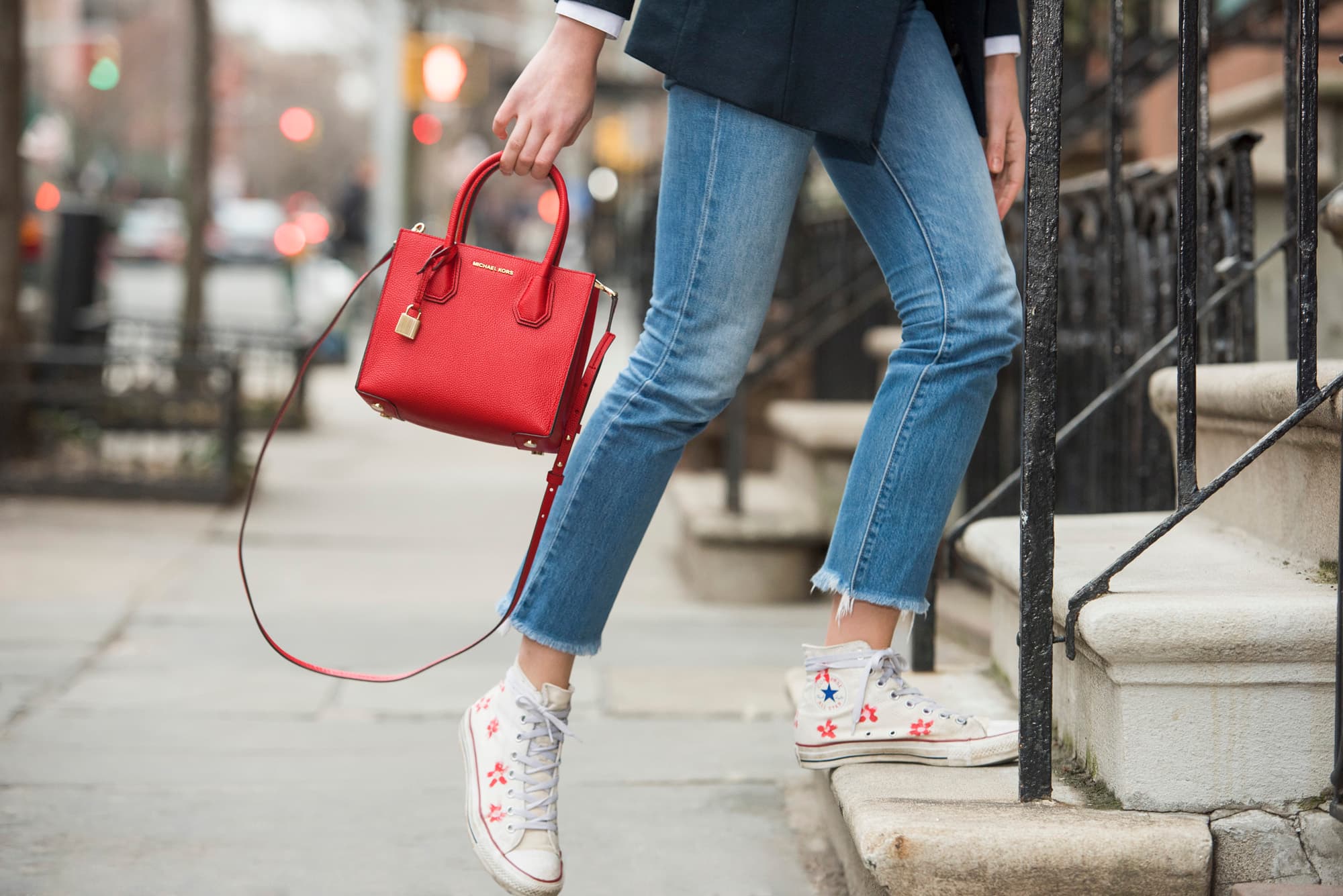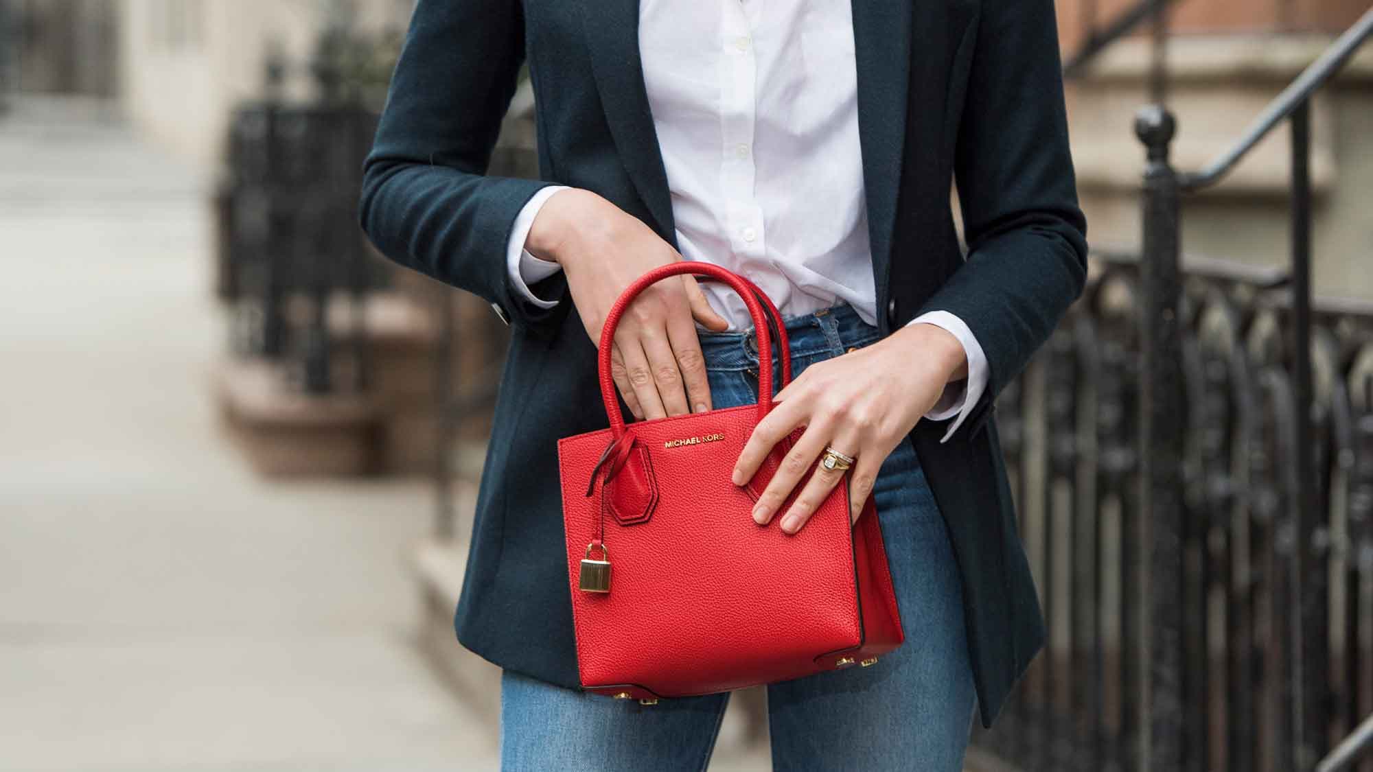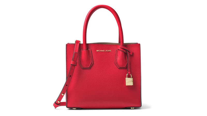 “I wore a MK Mercer crossbody in bright red—I have a thing for red bags. It’s my favorite color, and I think it’s a nice, somewhat neutral alternative to black and navy. I love the little gold lock detail on it and that you can wear it with or without a shoulder strap.”