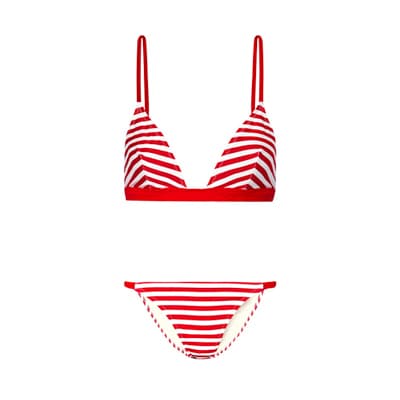 I'm just going to preface this by saying, I'm the token American here at The Cov and I obviously have a real life problem with stripes. But it's summer; there's lobster rolls to be eaten and dark and stormys to be drank—so, whatever. I'm headed to the beach house for what is the epitome of New England summer: fourth of July weekend. In an attempt to live by that whole "pack simply, live simply" thing, I'm chucking these items in my carryon alongside some shorts and calling it a day. First, a classic two-piece I literally plan on living in. Second, strappy leather sandals that are equally appropriate for ice creams runs and cobblestone bar hopping. And lastly, a warm-weather knit, because freezing mid-flight is the worst. Plus, what's comfier than bundling up in summer cotton, burying your toes in the sand and taking in the sunset from a beach chair, drink (sans iPhone) in hand?