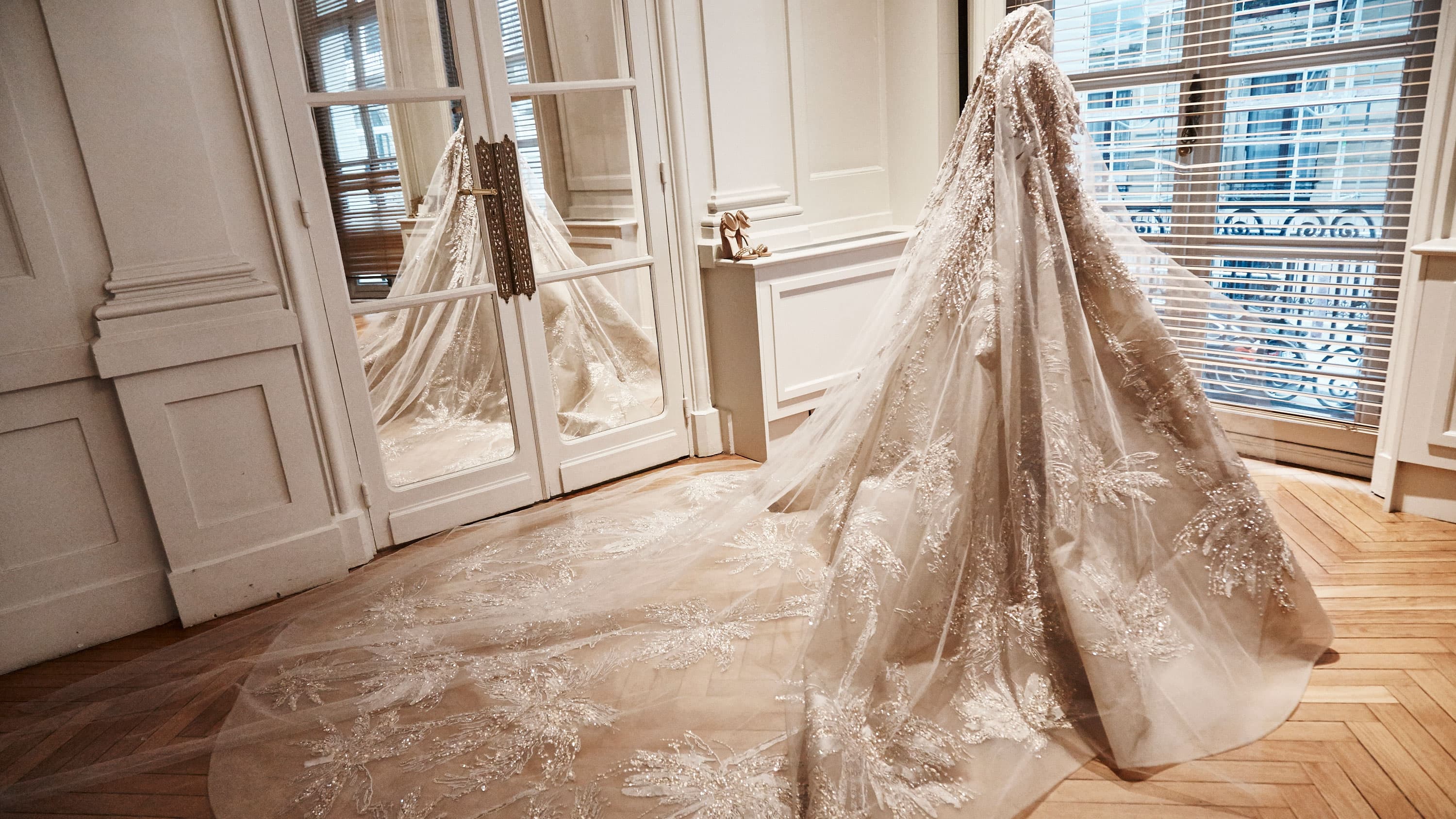 Star-shaped and palm-tree motifs embroidered in crystal were seen throughout the collection. More delicate embroideries inspired by Arabic calligraphy also had a strong presence. Evening wear is still the crux of haute couture and traditionally, the couture show closes with an exquisite bridal look. This season, Elie Saab closed his spring/summer 2017 show with a spectacular gown that kept its voluminous shape with a crinoline and a tulle petticoat, and featured a train and veil that used over 30 meters of tulle.