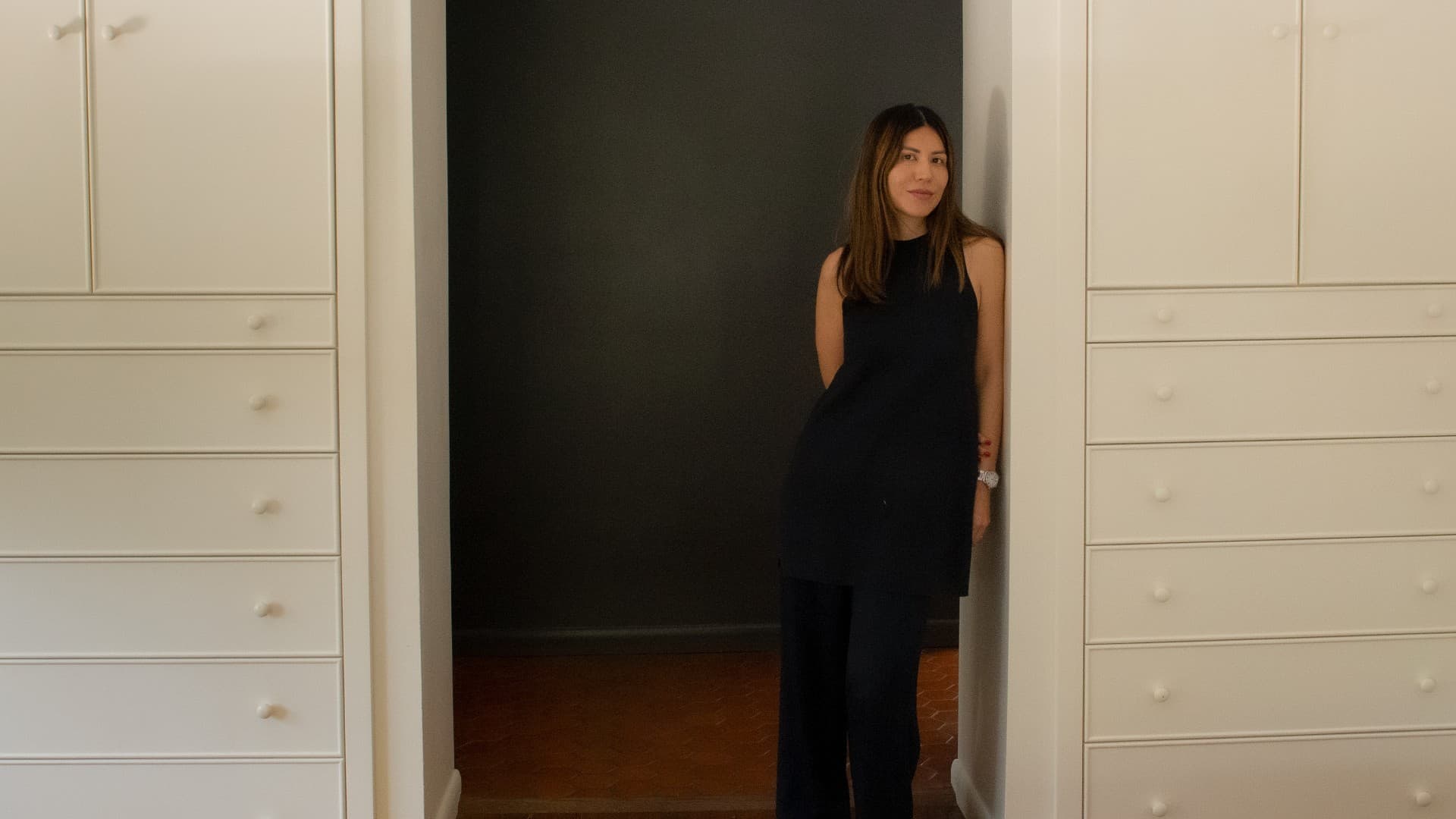 “I think bedrooms should be for sleeping,” shoe designer Emme Parsons says from her Palm Beach home. “Really clean, simple sleeping spaces with very minimal distractions.” She gestures to her sparsely decorated room, blanched of color. The bed, awash in white linen, lies in the center flanked by tables sculpturally draped with corresponding cream-colored fabric. The walls are a soft white, the floors a rich chocolatey wood. “We don't have a TV. It's literally just the bed and two side tables,” she says. “And a bathtub,” which sits beneath a white Noguchi lantern directly in front of the bed.