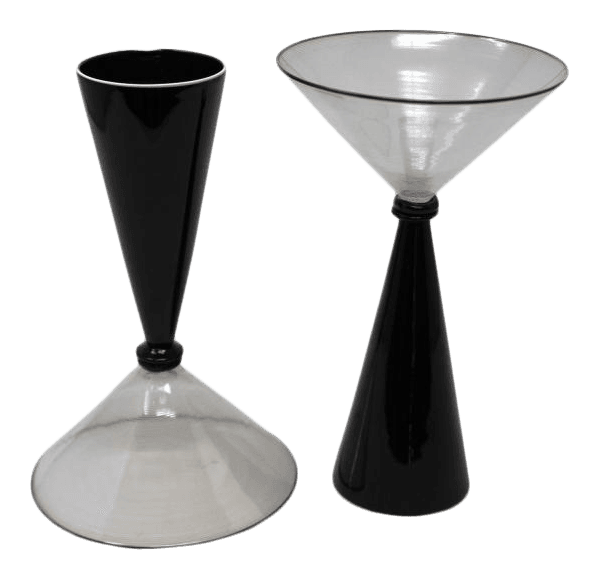 “This bicolor stemware is designed to be either a champagne flute or martini glass depending which way you chose to hold your glass. The utilitarian and artisanal design make these truly special conversational pieces.”