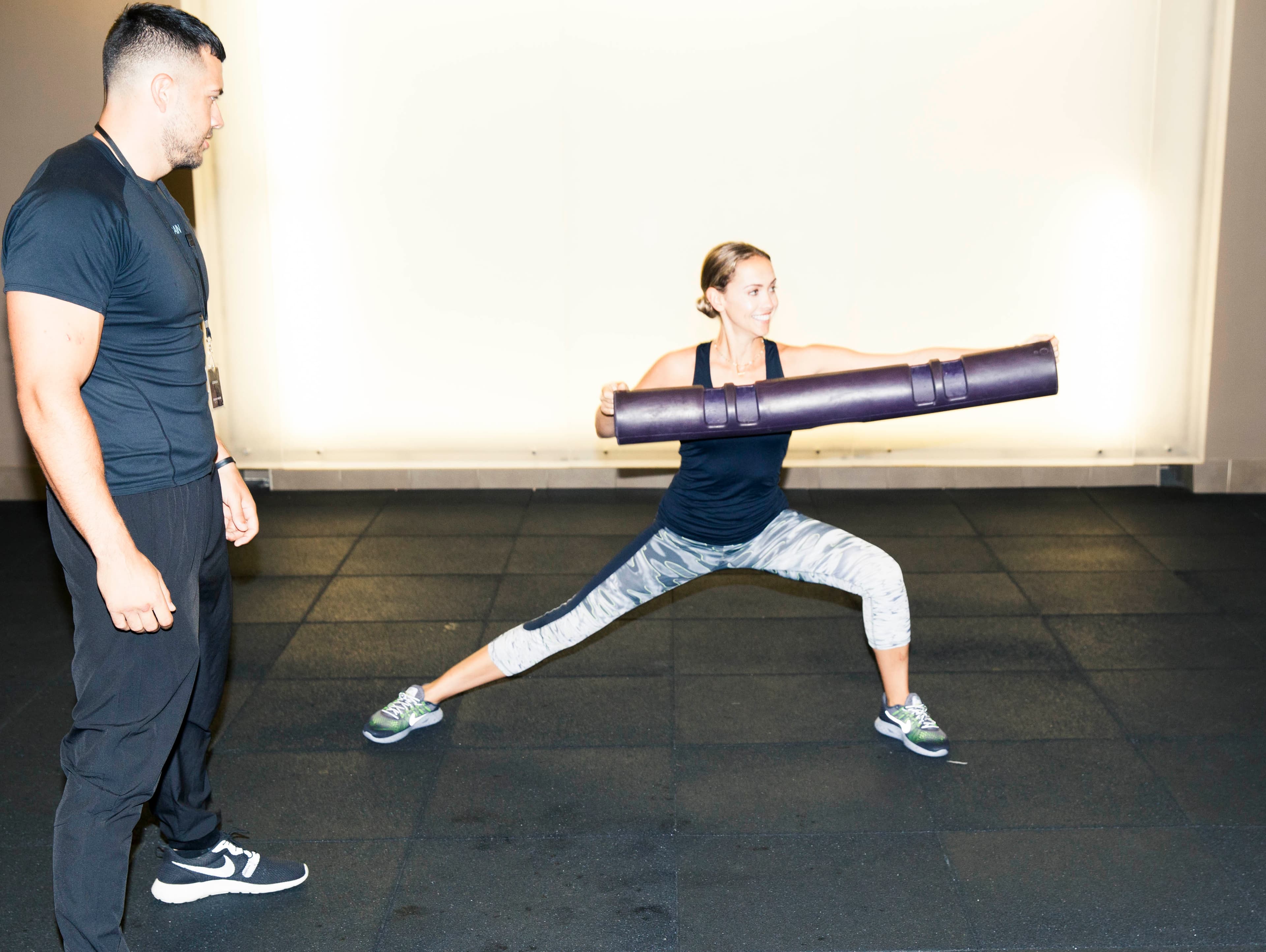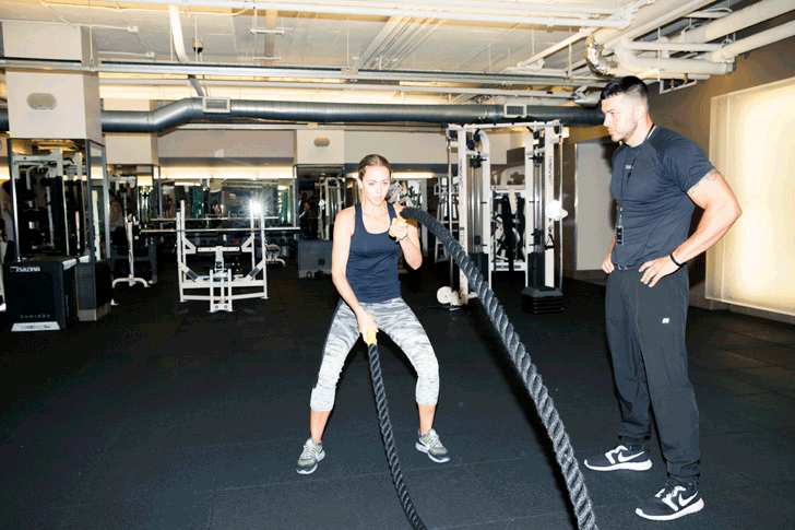 This is not the thing I do every day, and this is not like me at all. I typically do not enjoy personal training sessions, because I’m not confident in my strength level. I joke that I’m purely decorative and not actually functional (har, har, but it’s not actually funny…), but boy, did this guy make me function. We did a bunch of these lunge-y things with a tube, and then I had to toss some ropes around, which was really hard and kind of I hated it, but I have to say—at the end, I felt a lot more accomplished than I ever do from flapping my arms. Then I got all stretched out and had to bite my cheeks not to giggle.