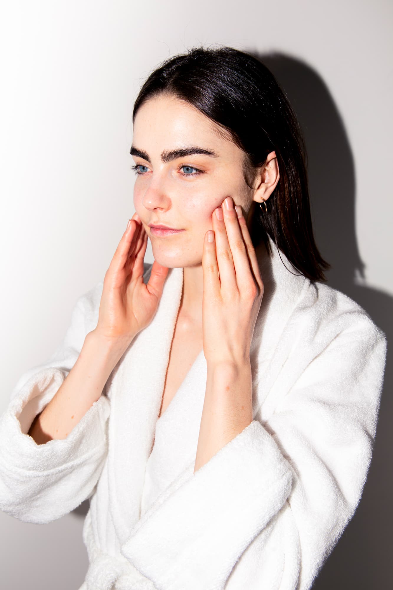 4. Sweep the hands across the brows and forehead, moving from the center out towards the temples.
