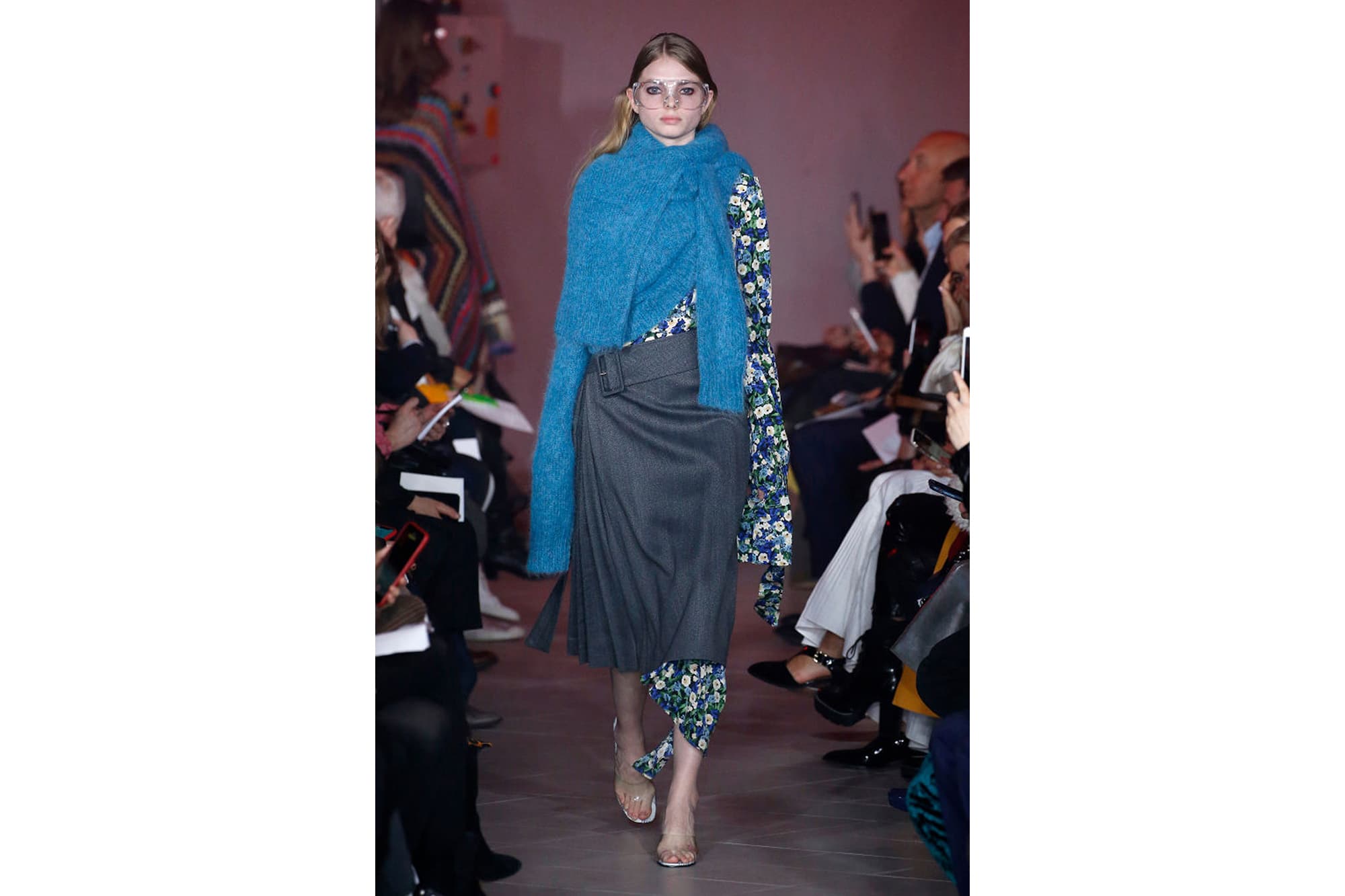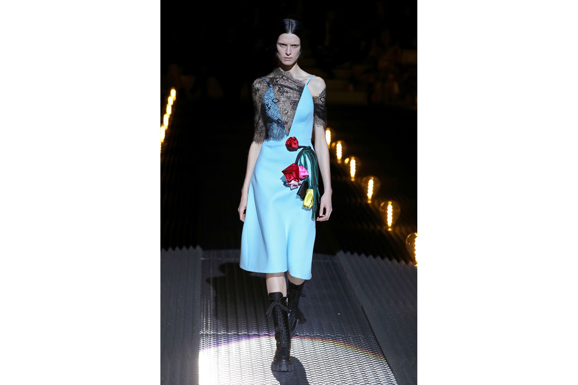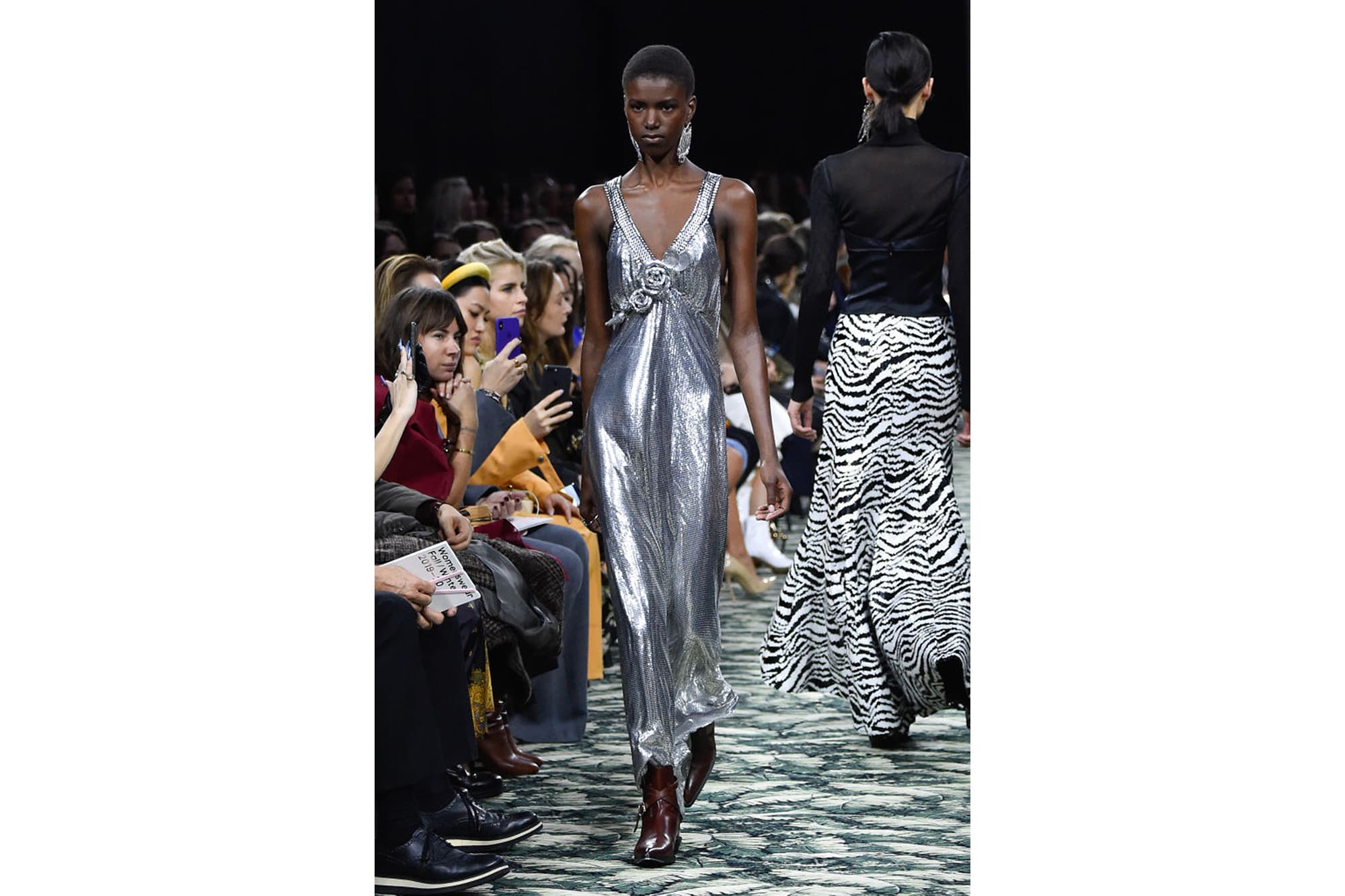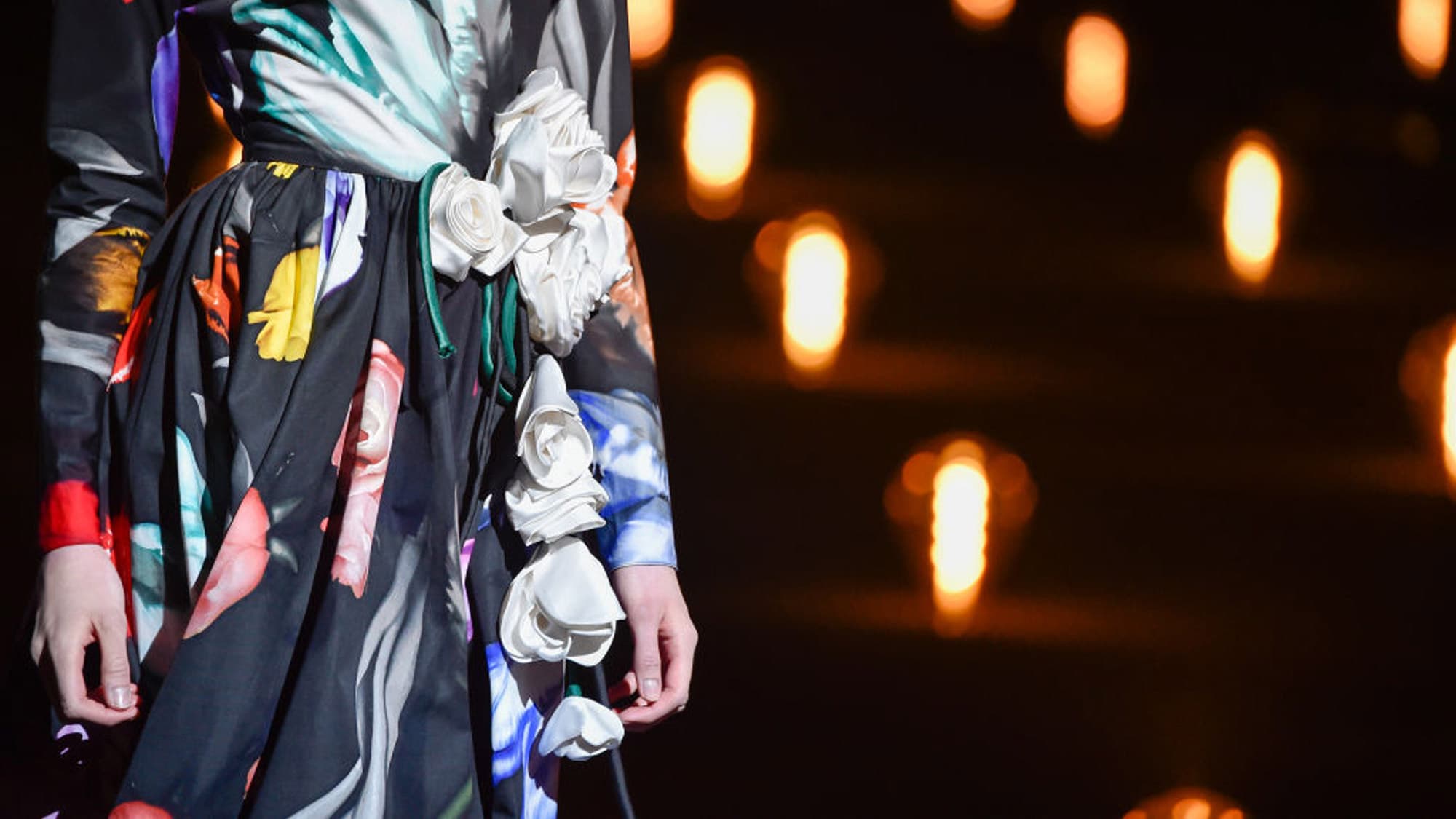 Photo: GettyMiuccia Prada has reversed the dark undertones that accompanied last year’s spring ’19 collection and instead opted for a more joyful design sense for the following fall. The first showing of this floral theme, her garments feature roses that seamlessly transition from print to an actual satin flower resting on top of the fabric. The rose motif was also included on the satin shoulder wraps.