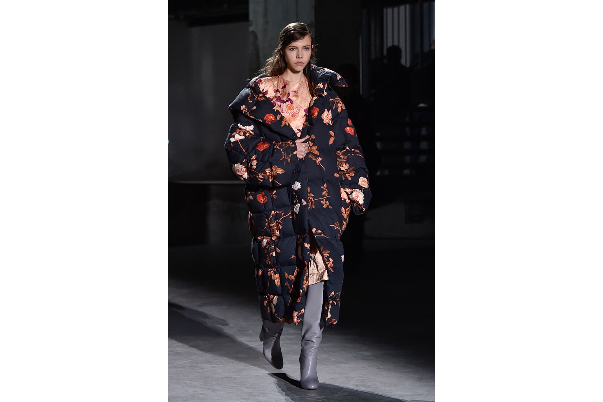 Photo: GettyInstead of a physical flower on these garments, Dries used lifelike embroidery and vivid prints to convey a tangible flower. Skirts rendered in floral embroidery grazed the knee, where they met boots with flowers twisting up the shaft. Two seemingly contradictory elements, floral print appeared on a full-length down coat. How’s that for wishful thinking?