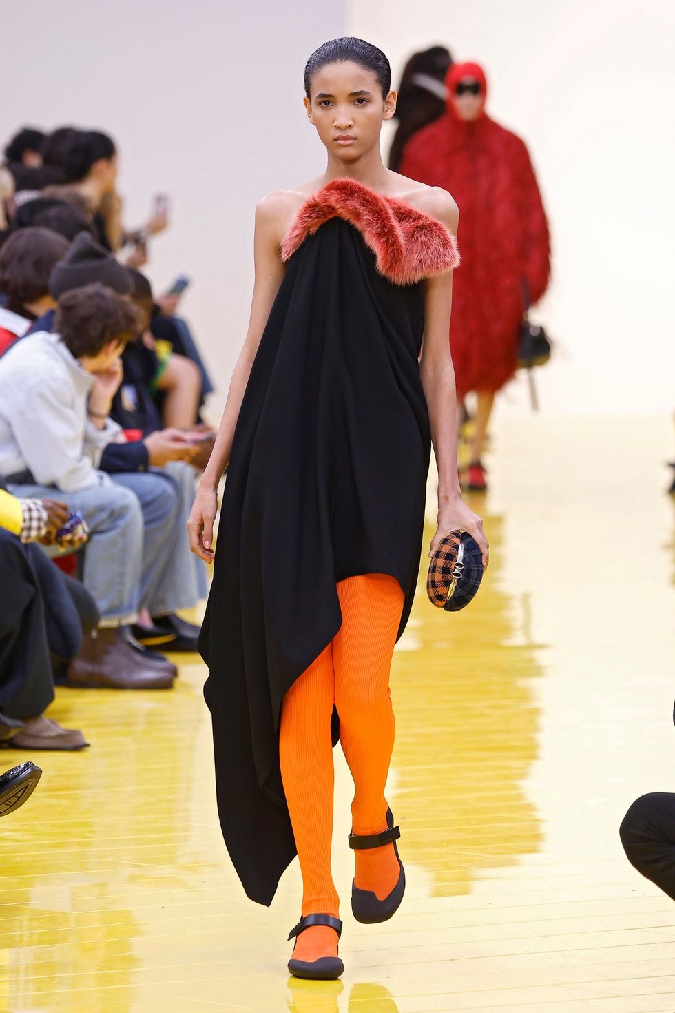 Daniel Roseberry has been flirting with some very literal animal motifs for both couture and ready-to-wear for some seasons now, and Fall/Winter was no different. There are always a few items in a Schiaparelli collection that really feel as though they defy expectations. This season it was a pair of “kitten” heels, faux taxidermy cat heads secured onto the toe of pointed mules. Elsewhere, a fur clutch with gold fingers that made it appear as though you were holding a hand, a leather shoulder bag whose strap was a gold peacock head, and hoop earrings with lifelike snails perched on them. Roseberry is finding his way when it comes to distinguishing his RTW from couture. There were slinky jersey dresses and some very good three-piece suits that gave away his time at Thom Browne, also many-a good coat—big fur trimmed ones and sleek evening jackets. It’s always a good runway when Roseberry is running the show.
