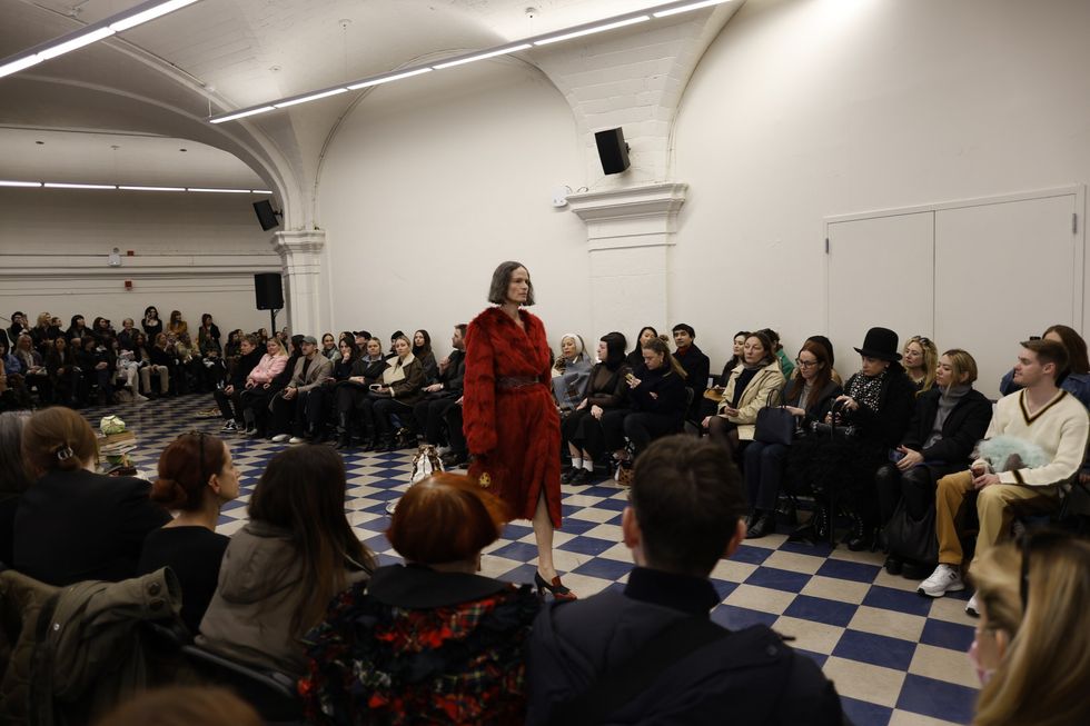 "Music go," Ramos speaks into her headset. "Lights go." The first model traipses into the crowd, this time clad in a darkly romantic dress embellished with rosettes rather than her streetwear. The models remember Barlow's instructions and adhere to the rhythm she and Ramos have set. Now, I remember none of those cues I've watched them practice, but am instead transported into the designer's fabulously weird world for the duration of the show. Once puppet master Mark finished her finale walk, she is met with screams of joy from all parties involved—hair and makeup, models, PR, and production. The energy palpable, you’d have no idea some of them had been at this for so many hours for this quick presentation of art, fashion, and creativity. The whole thing lasted about 11 minutes.