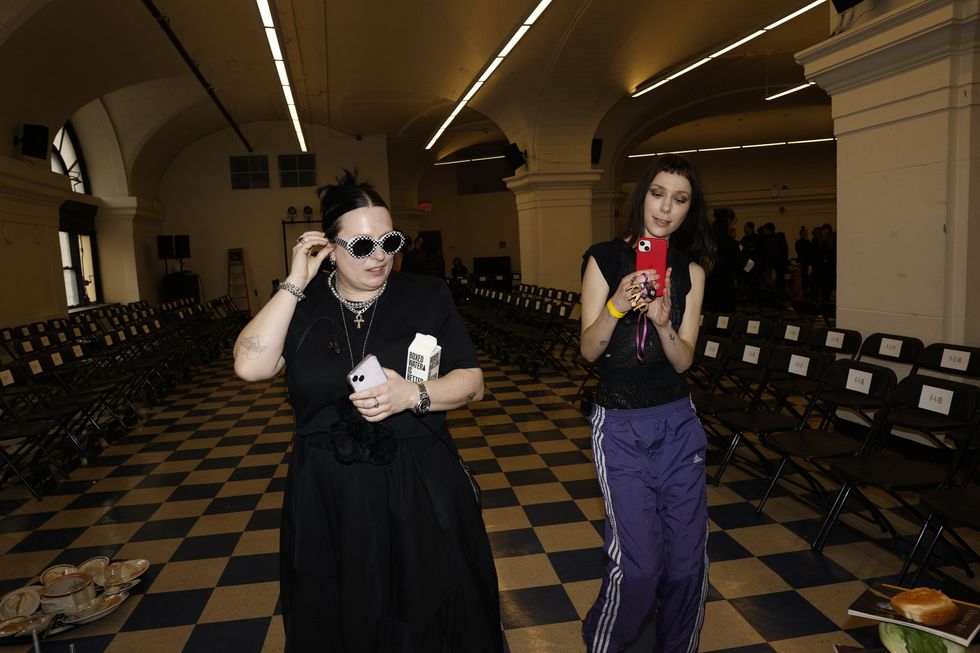 “We’re opening doors in five minutes,” she bellows. “Clean up the lettuce!” The set designer drizzles last minute marmalade on her masterpieces as assistants debate whether a trash bag is part of the set or actual trash—the former was decided upon. Soon, the front doors open and guests trickle in. The front row hosts everyone from Orville Peck to Richie Shazam to Lynn Yaeger. After notable editors, influencers, friends and buyers conclude instagramming photos of the wacky props, they take their seat for the show to begin.