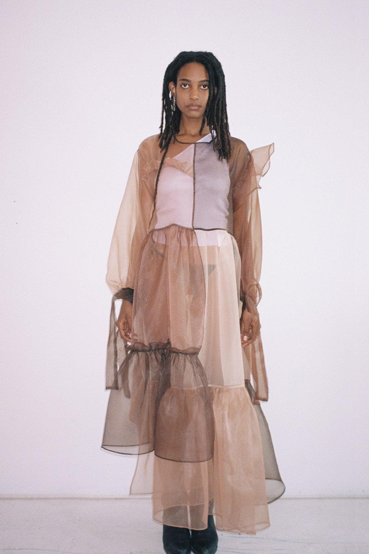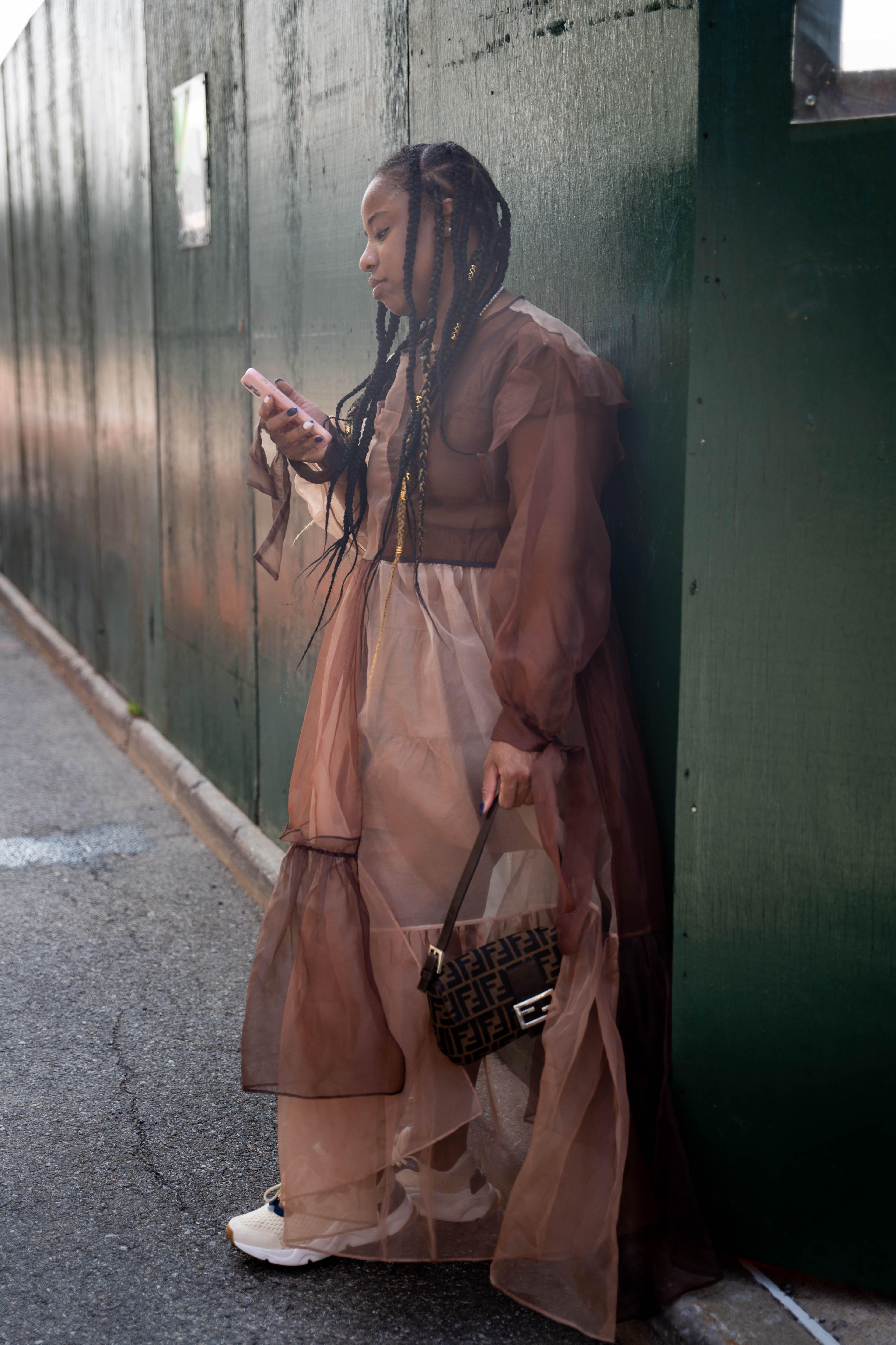 "This was the last show day, which started on Sunday with Telfar and Tory Burch. I chose this dress because it's ethereal and romantic, and I'm really into chocolate brown lately. But I paired it with sneakers for a fun, comfy touch—and it's much easier to run around the city to shows that way. I wore it with my favorite new bag: a Fendi baguette from Rebag. I love, love, love shopping resale and adding to my bag collection in a sustainable way."