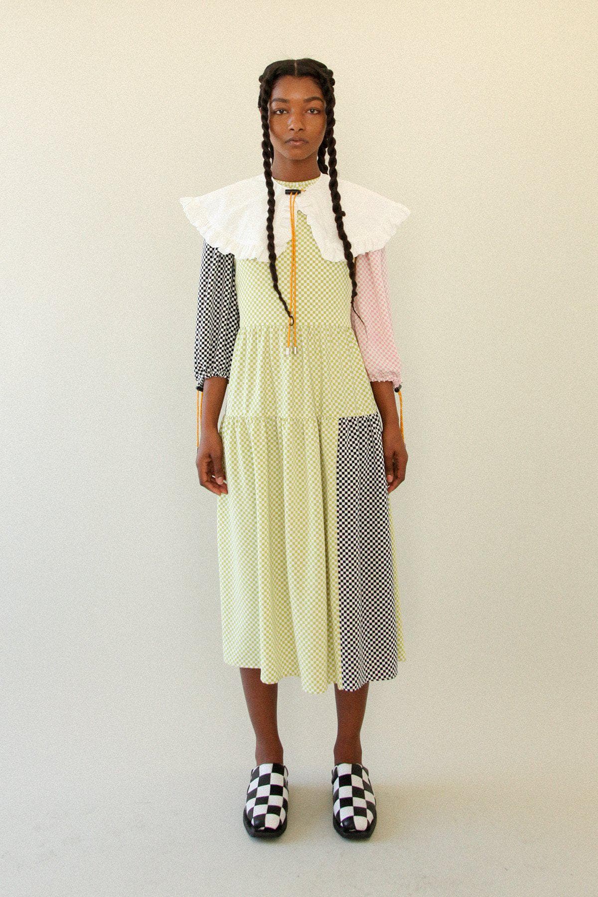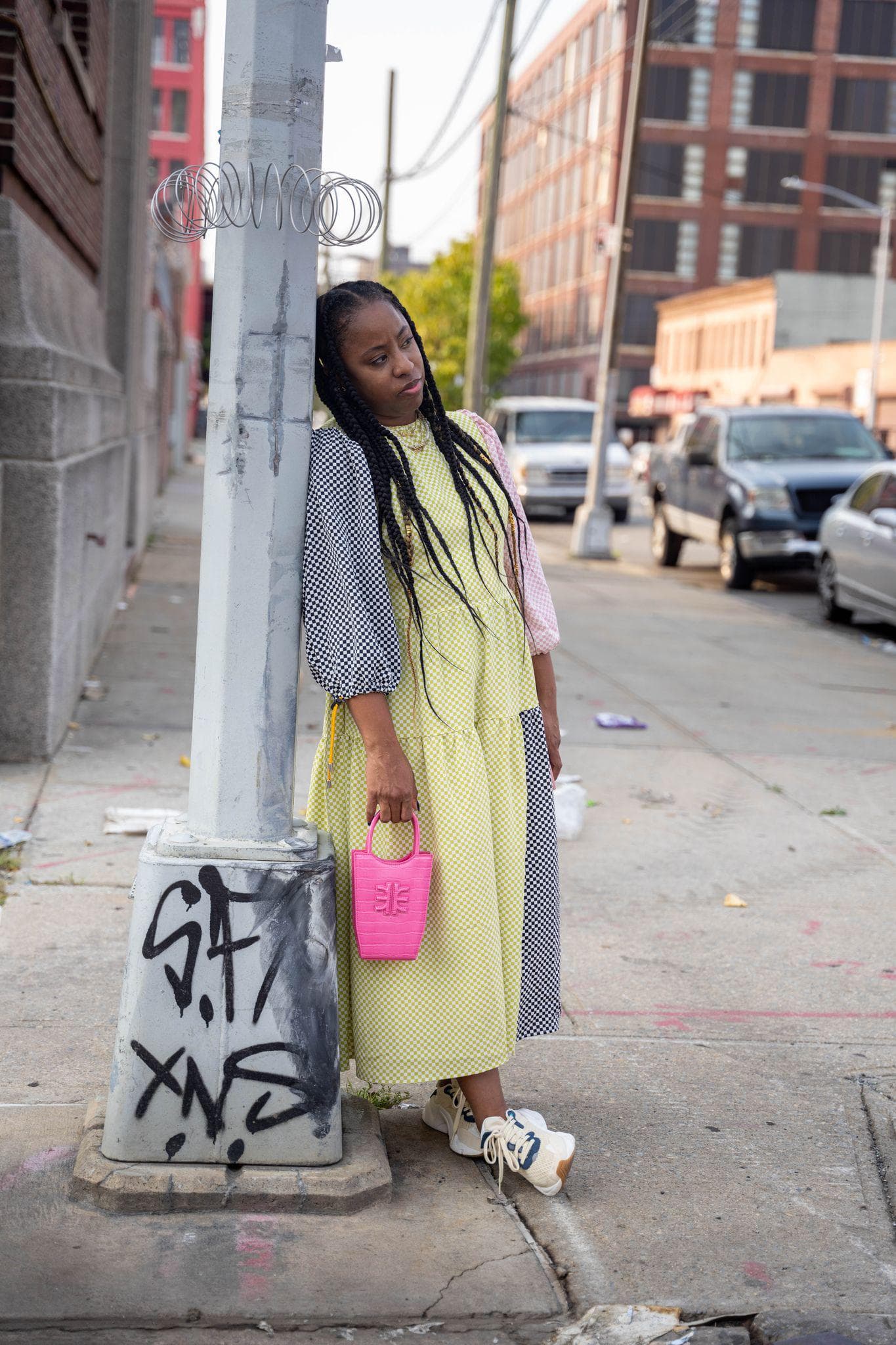 "I wore this look for my first day of shows—Collina Strada, Christian Siriano, Harlem's Fashion Row—and I chose it because it feels playful and full of life, which was definitely my energy going into shows and seeing ~fashun~ IRL again—and also reuniting with some of my best friends. I love the colorblocking and print mixing in this KkCo dress. It's such a statement piece, but in a really effortless way. I love this bright pink JW Pei bag [paired] with it—the color really popped."