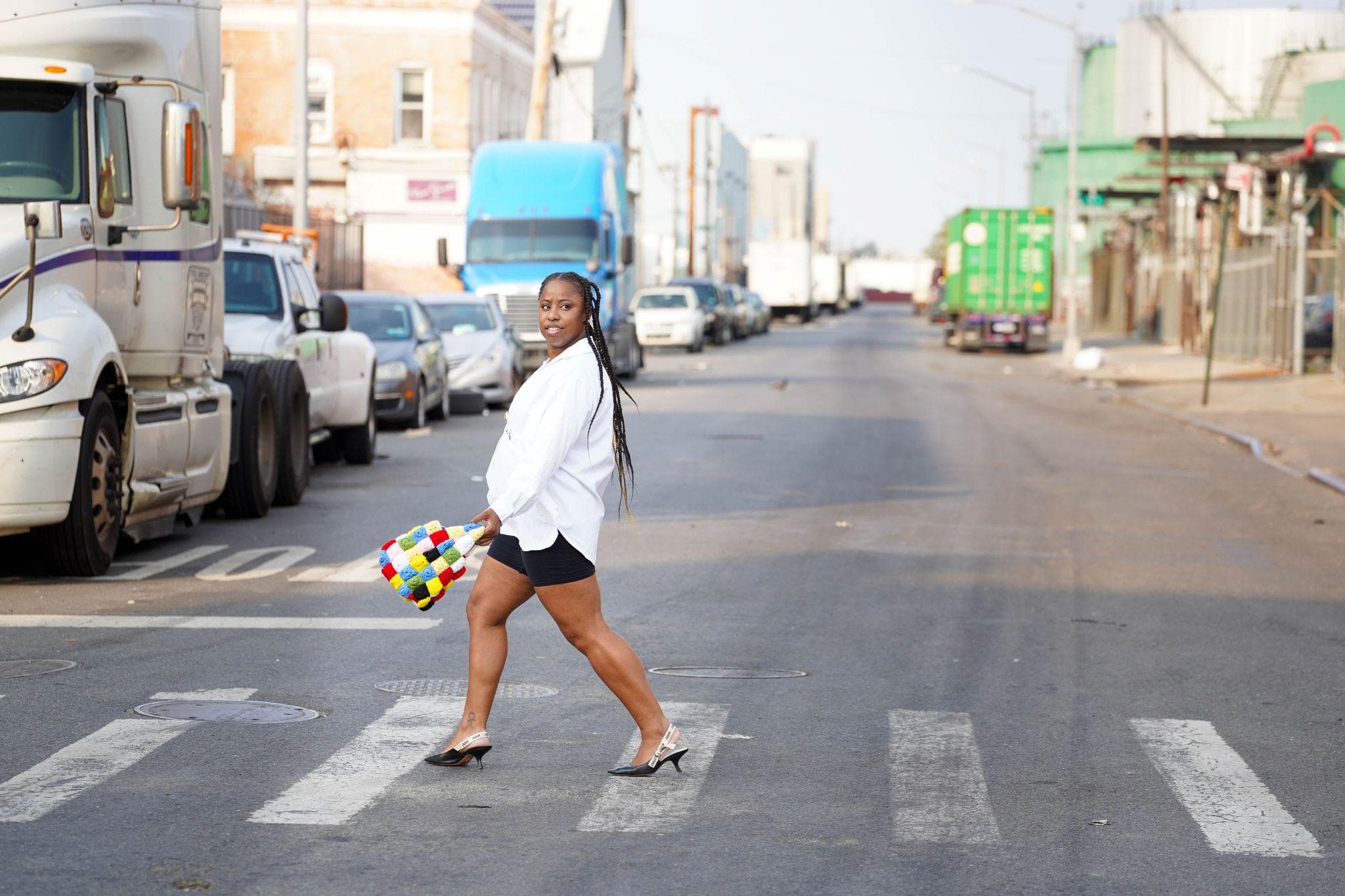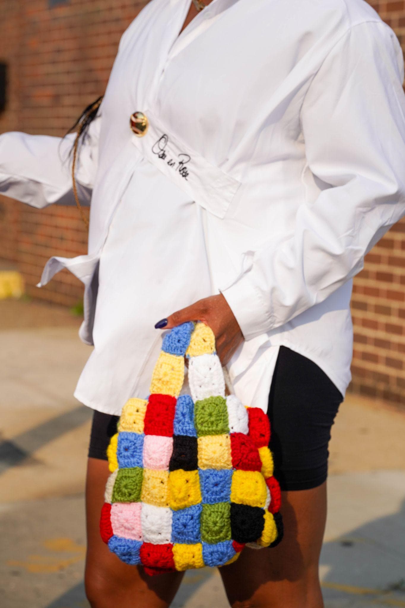 "I've been really into basics lately with a pop of color by way of accessories. This bag from The Series is so gorgeous—it's hand-knitted and created exclusively of pre-existing materials. So I paired this with a crisp white button-down from Osei en Rose, bike shorts, and heels for a chic, functional look that still feels special."