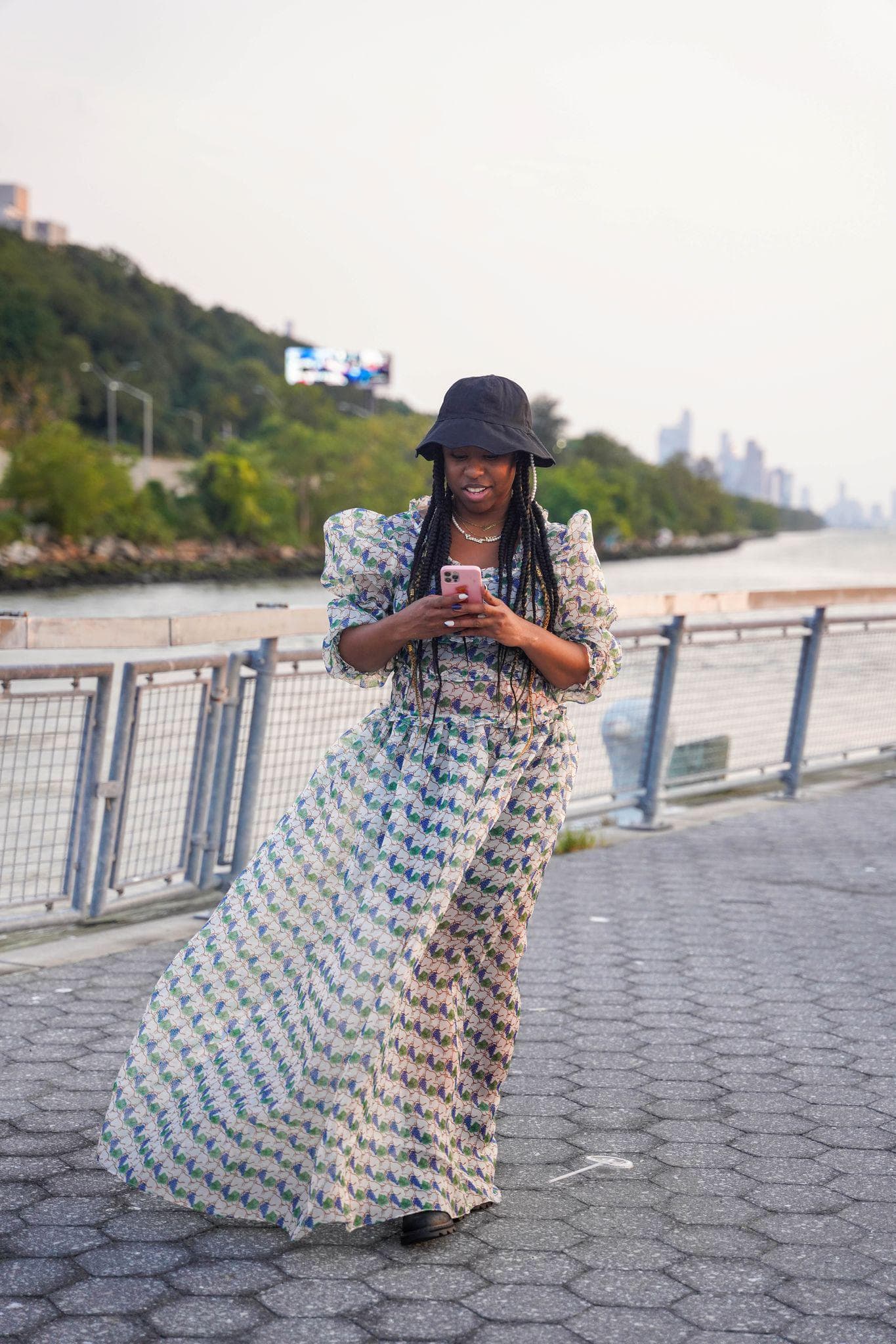 "I love wearing breezy dresses to spring shows. They're so comfortable but look glamorous and dreamy when picked up by the wind coming off the Hudson River. This style is from Shrimps and has a fun grape print all over the dress. I love contrast, as I mentioned before, so I styled this with a pair of edgy combat boots and a '90s-style bucket hat with a pretty pearl chain."