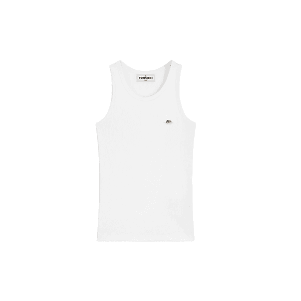 "Those iconic Fiorucci angels got me again. A classic white staple tank—but with a twist. The patch detail makes it feel way more unique and I'm waiting by my mailbox for this to arrive." - Natasha Sheridan, Social Creative Lead