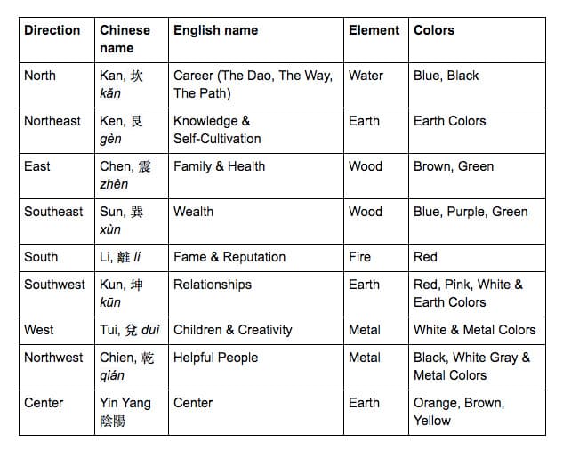 “When choosing what to put in a section of your desk, refer to the table below. Think of the symbolism of things, so, if the element of the northeast is ‘earth,’ you could place an agate paperweight there, because agate comes from the earth. If the west is ‘metal,’ you could place your silver letter opener there. You can also place objects that are any of the colors mentioned for each sector.”