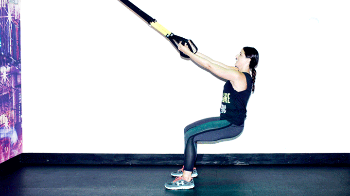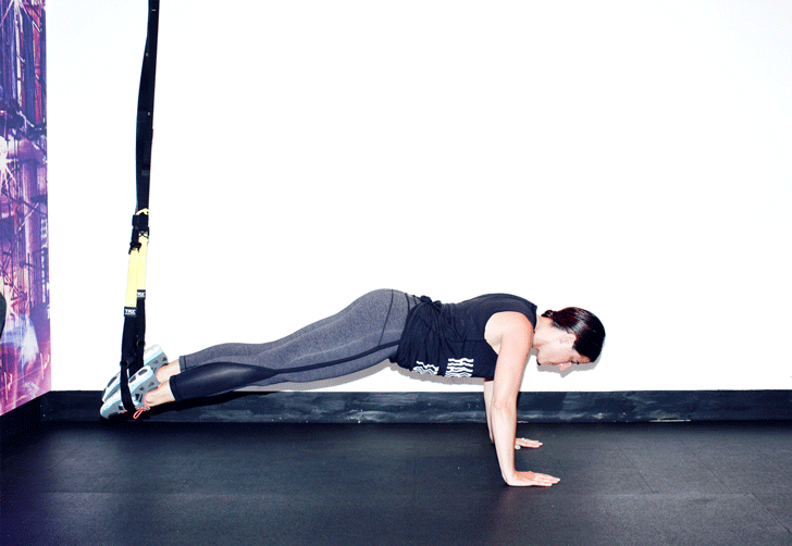 Measure the straps to hit you in your calf muscle. Then pop one toe in each strap before descending into a plank position on your hands facing away from the midpoint. Raise your hips in the air maintaining the straight alignment of your back as you bring your toes towards your face to make a triangle at the top. Then slowly push your legs back until you're back in that straight plank and slowly lower down to a push-up then back up to your plank.There’s no way around it, if you’re feeling a greasy-food and sugar hangover, getting a high-intensity sweat session on with fast-paced and heart-palpitating moves (in intervals) is the best way to feel better fast.