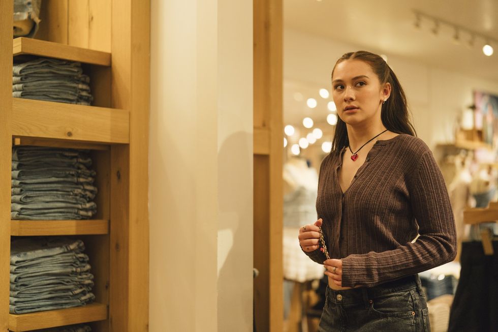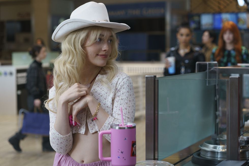 Fig was the mall goth, with "slightly nerdy layers" to show off her scientist's instinct. "She's not using the gaze and her body in the same way as Cherry and Apple," explains Millman. References ran from Aaliyah and FKA Twigs to Fairuza Balk. During fittings, Shipp would survey the rack, say "hear me out," and proceed to layer a dress, a bustier, a long sleeve, a coat, a belt, an anklet, and approximately "700 necklaces." Meanwhile, Pickle, a former Free Eden employee played by Emma Chamberlain, embodied the store's style most of all. "Pickle was really like a Texas ray of sunshine… she's the most sort of mall boho, just like earnestly into mall culture," says Millman. "She wore Uggs, and she has a progression where the Uggs needed to reflect the journey she'd been on, and at one point, Meredith was like, there should be a hole where the big toe is. So, we really put those Uggs through the wringer."