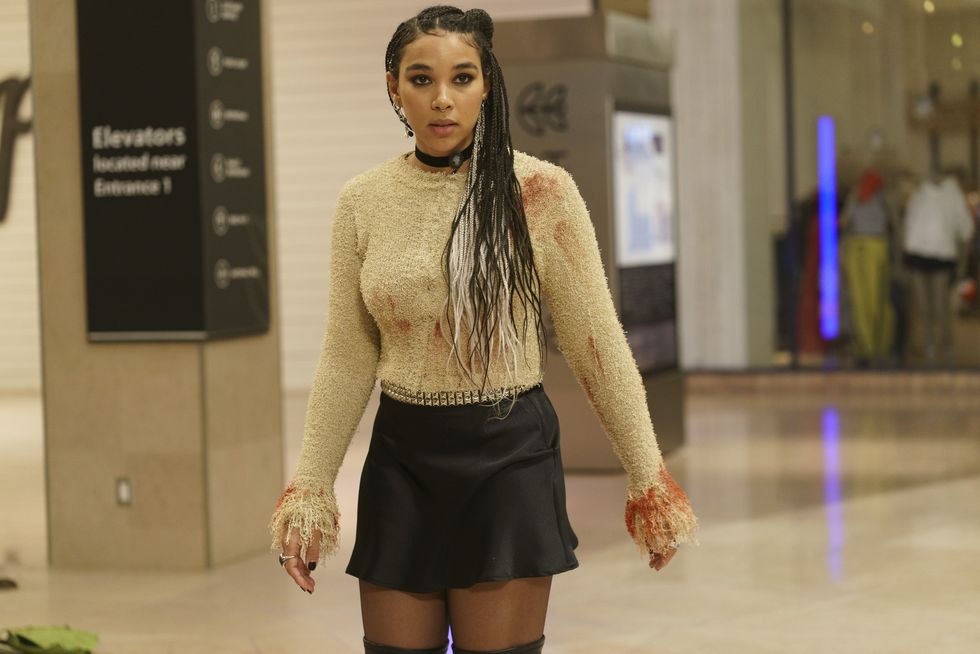 For HWIC Apple, the north star was early Lana Del Rey and her penchant for accessible glam. "There's this interesting high-low there that she engages in, and we wanted that for Apple," says Millman. Another inspiration was '90s Rose McGowan, and a color story that leaned into deep reds and blacks to complement Apple's red hair. One of Millman's favorite Apple looks was a rubber bondage top with a super-low, plunging neckline that she wore with capris and heels, stomping through the mall. "To me, that look feels like the absolute embodiment of her character," says Millman. "True literal bondage. She is a dom. She is the baddest bitch."