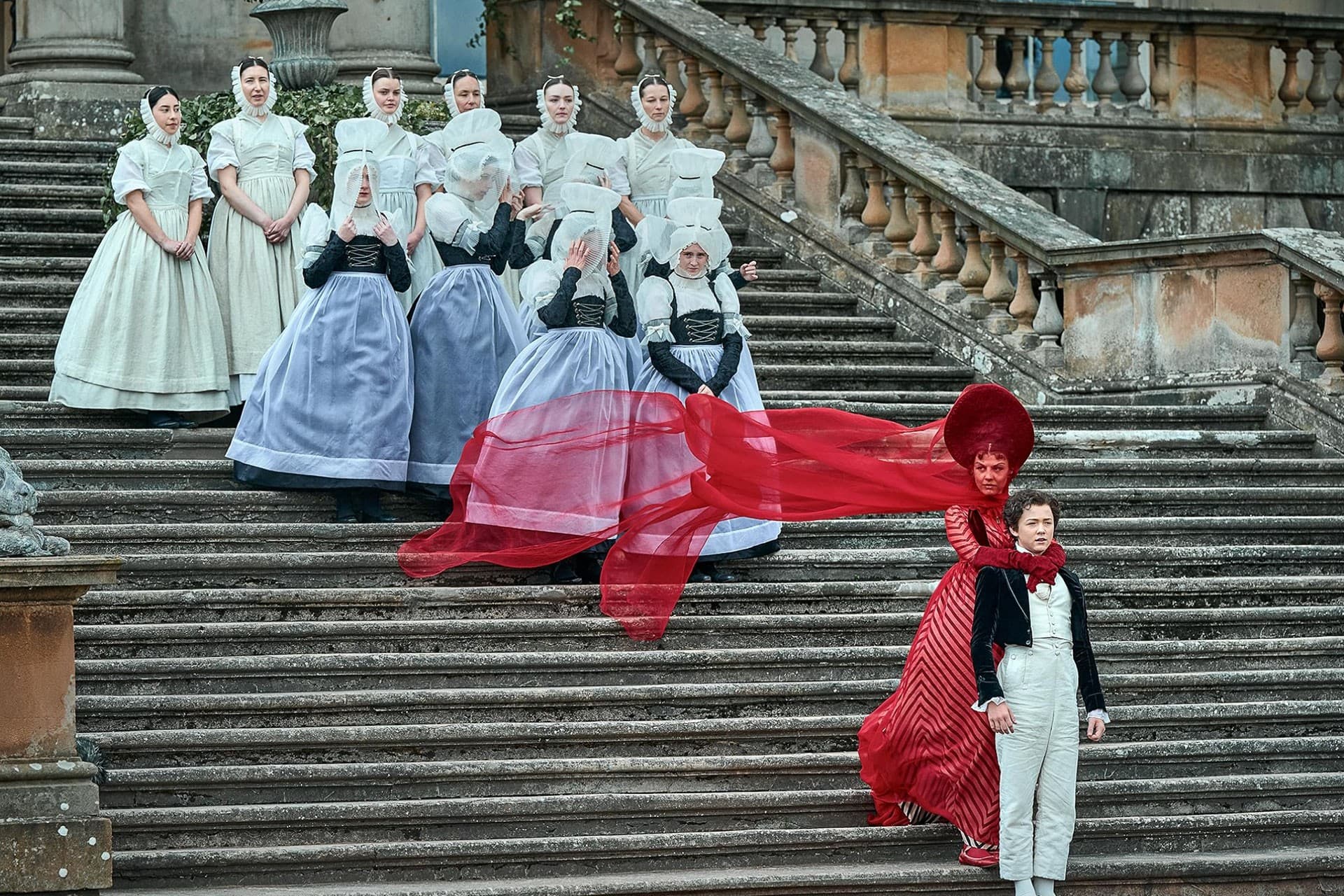 Maison Margiela FW25 Couture Maison MargielaThe use of color, too, is also symbolic throughout the film. At his mother's funeral, the lineup of veiled and robed women each hold a singular white lily as they process behind her white stone coffin, symbolizing purity and rebirth. It's a stark contrast again the wreath of bright red flowers around her face—a color that represents her identity throughout the entire film.