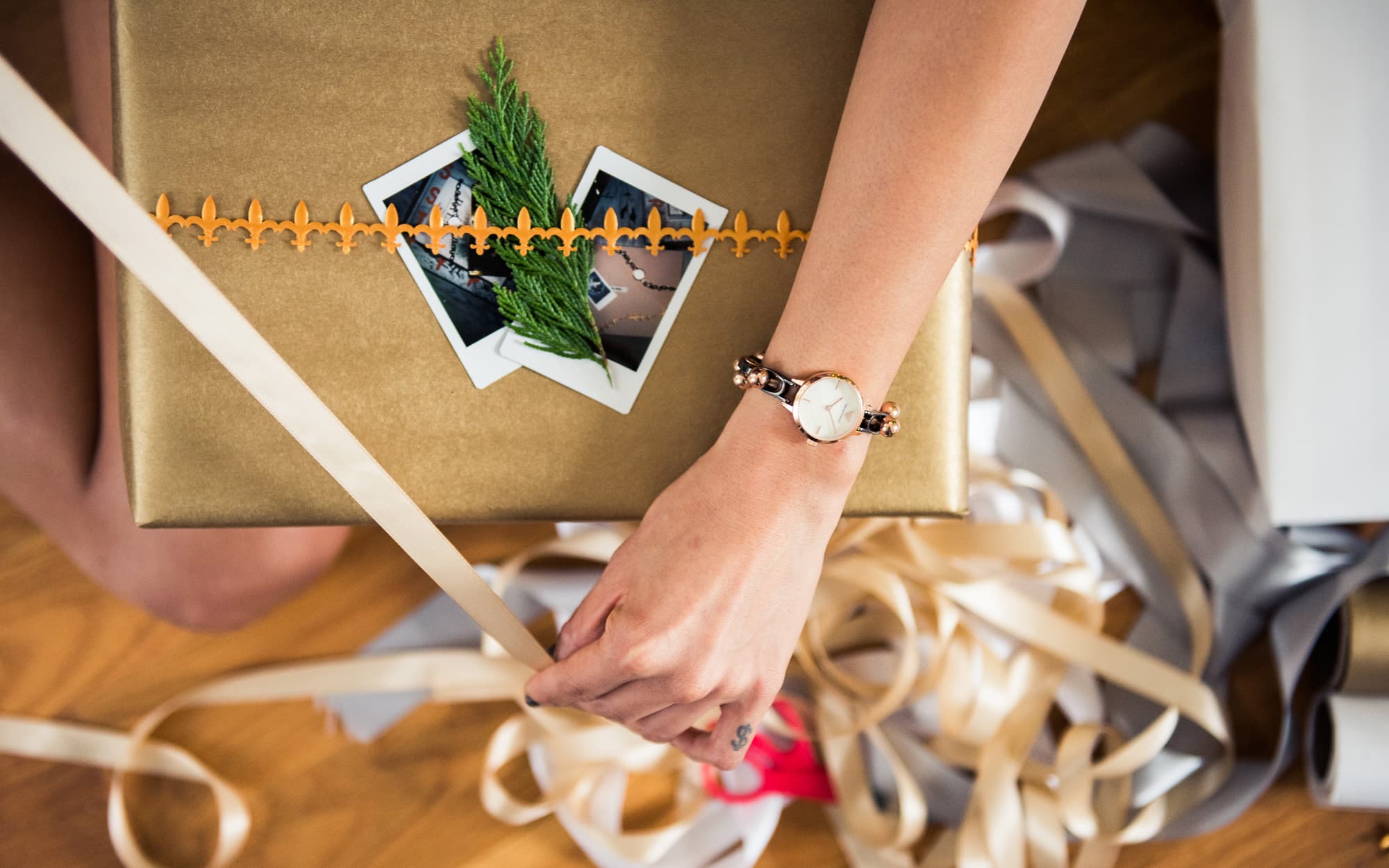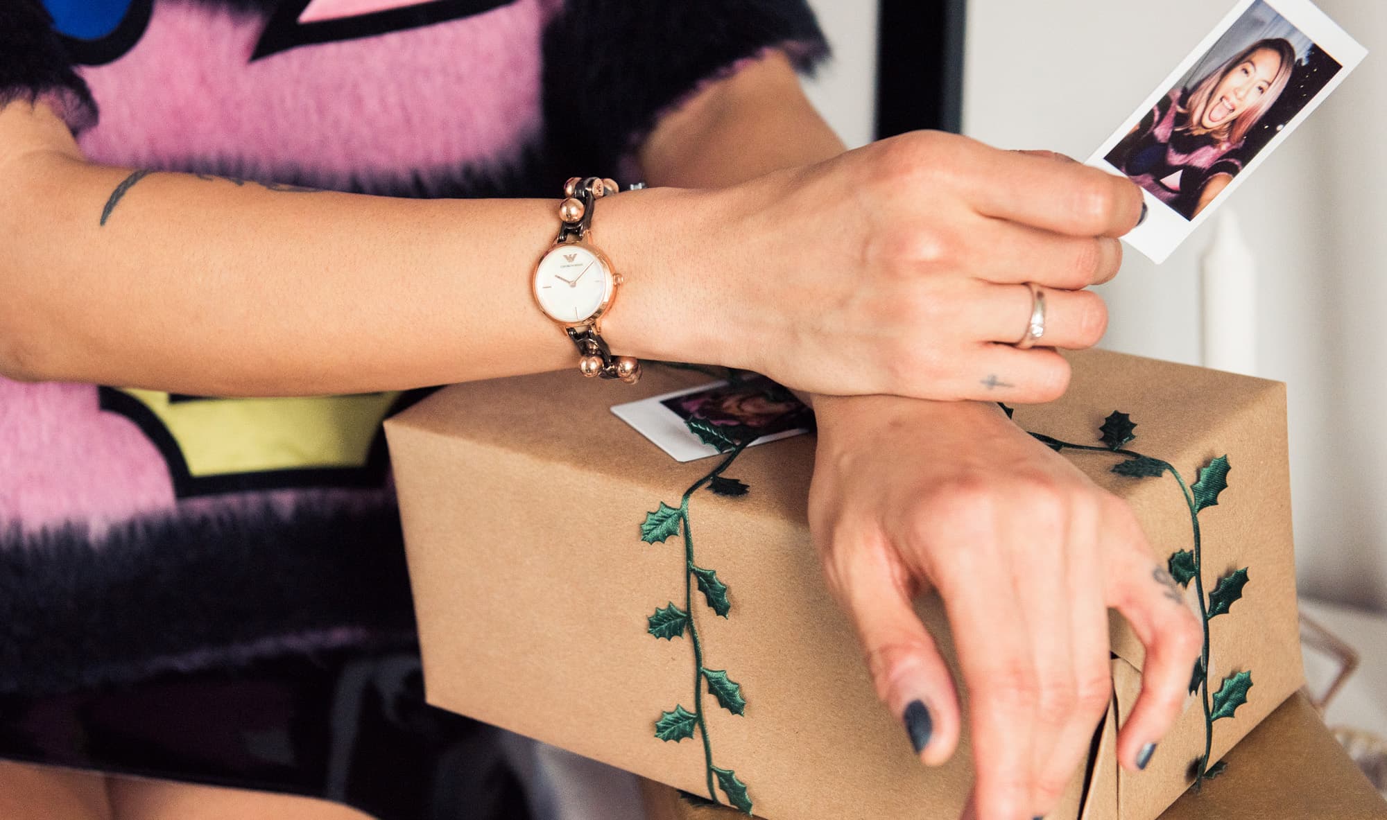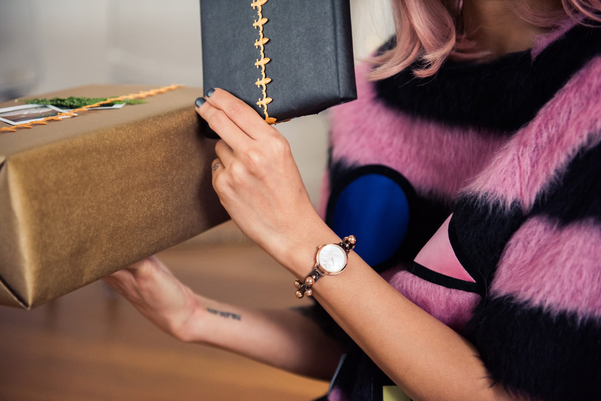 Rather than wrap your gifts in anything that screams ‘OHMIGOD I’M SO EXCITED IT’S CHRISTMAS’ from 40 feet away, skip the usual red, green or glitzy metallics in lieu of a neutral foundation. Winter white has a perennial Carolyn Bessette Kennedy vibe, kraft paper offers endless options for personalization, black feels elegantly restrained, and a subdued gold or silver is festive without veering into Santa cartoon territory (bonus points if you match your timepiece, the way May has with her Emporio Armani watch here, to whatever you wrap with).