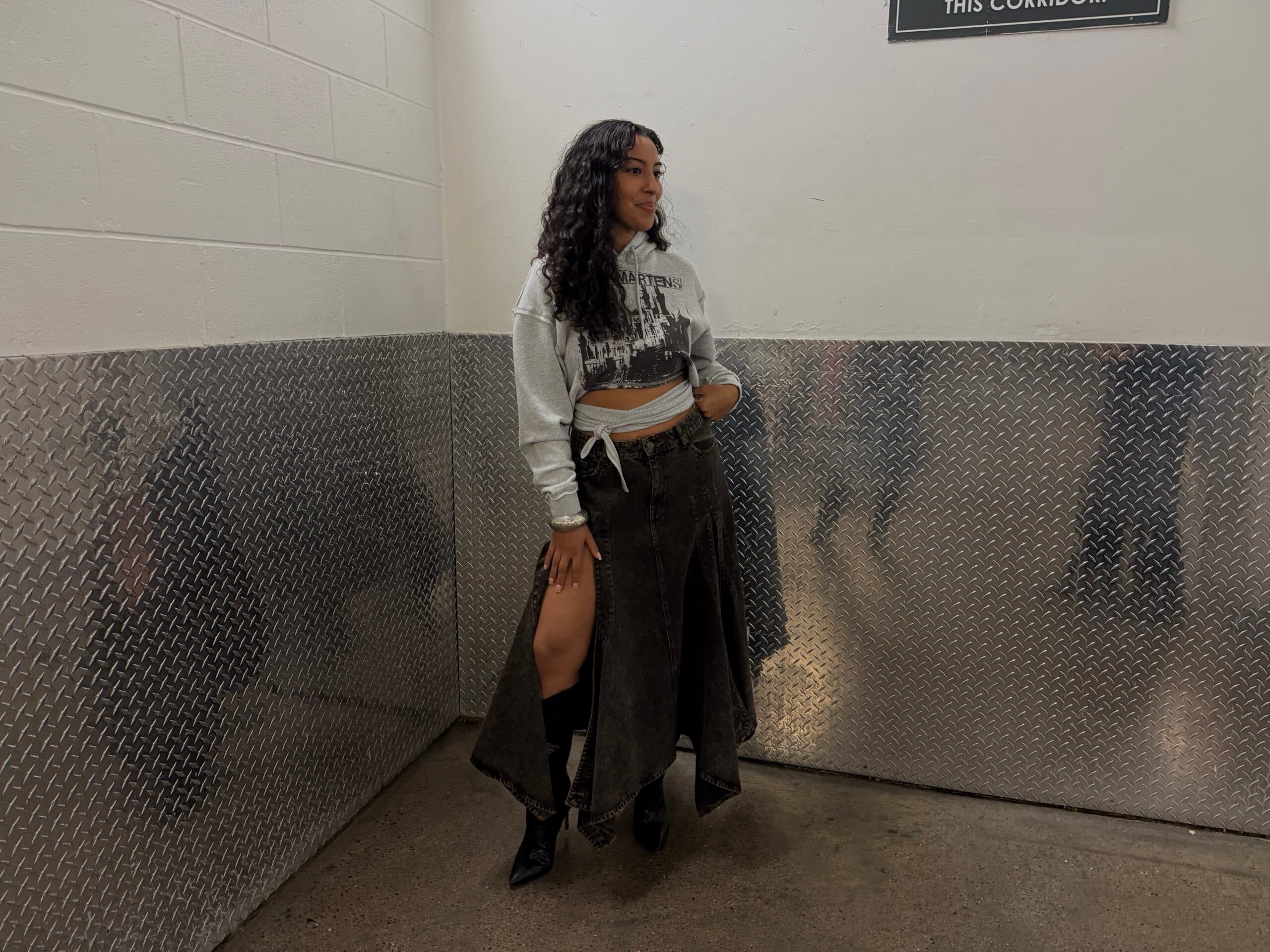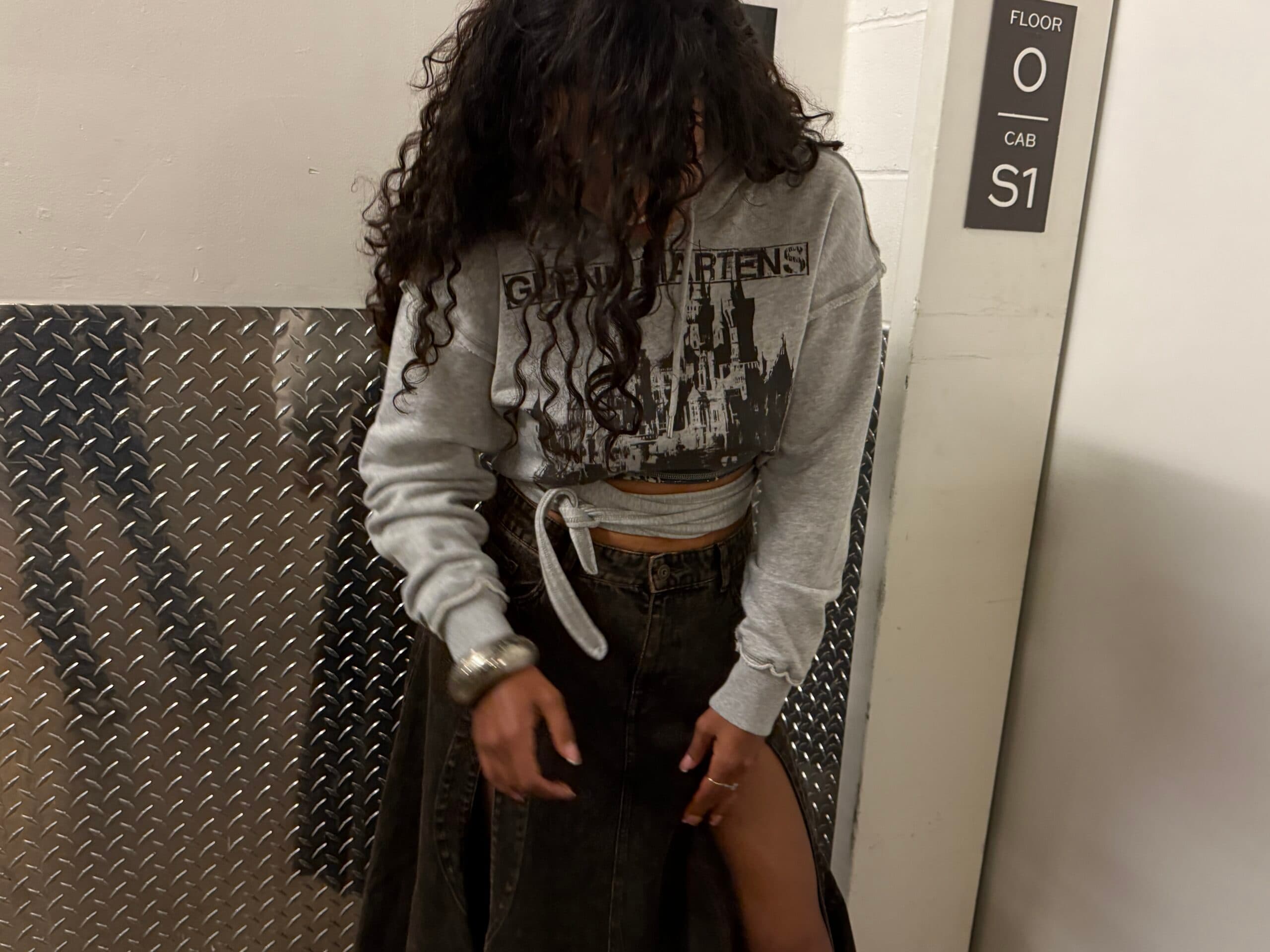 Coveteur""There's nothing I love more than a snatched-waist moment, so a cropped hoodie that provides volume at the bust and ties at the waist is my version of an achilles heel. I'm also obsessed with the handkerchief hem on this long denim skirt. I'm in my Grown™ era, and the peeks of leg you could see as I was walking felt so flirty in the most mature way. Très sexy." - Sierra Cook, Graphic Designer